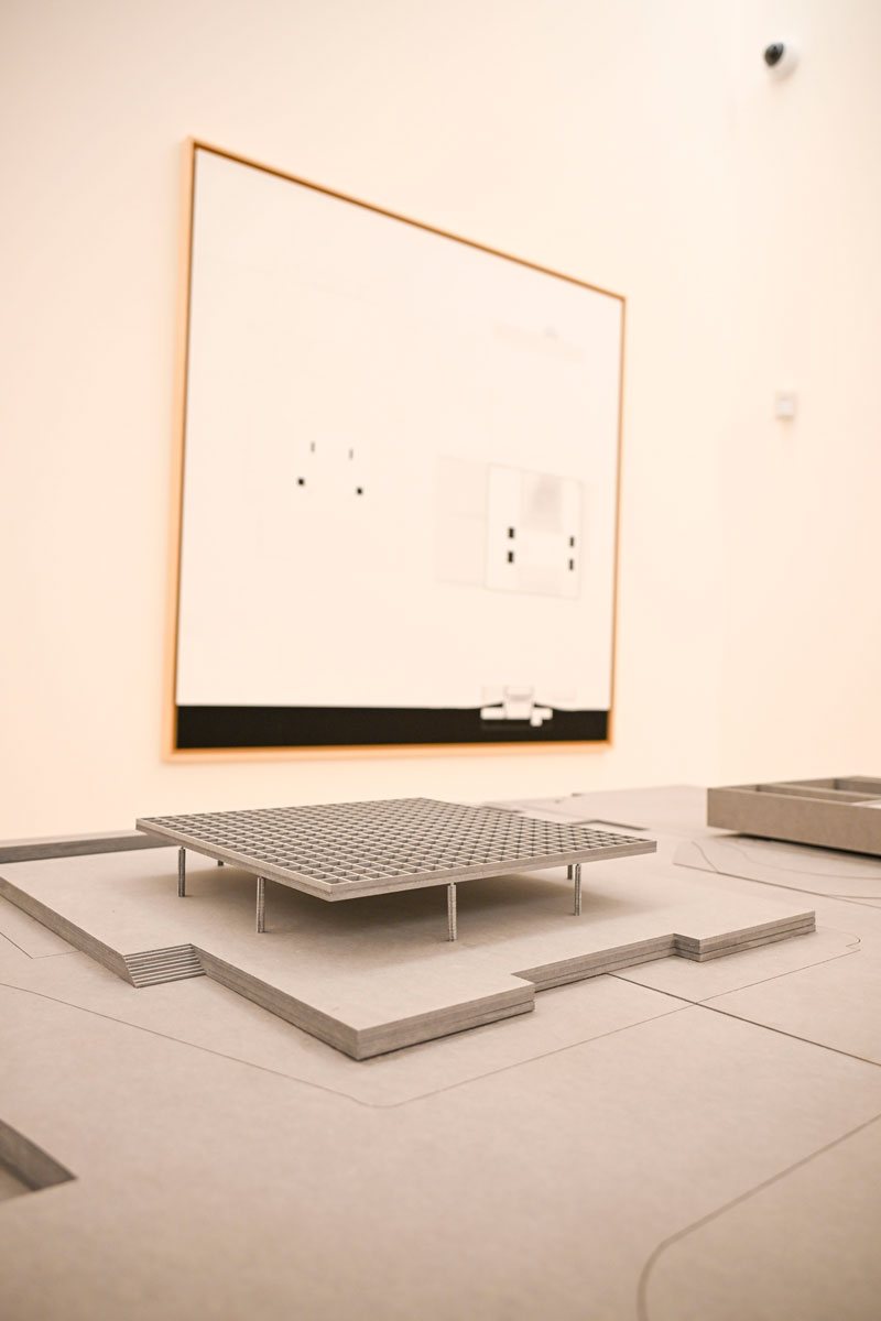 As grandes telas, com quatro, cinco e mais metros, que apresentam plantas, cortes e alçados, impressionam à distância pela leitura quase abstracta e dicromática de jogos de cheios e vazios. De perto, revelam o rigor dos desenhos técnicos, maioritariamente à escala 1:20, reinstalando a tensão entre contemplação estética e instrumento disciplinar. As maquetes, partilhando escalas e abstracção semelhantes, reforçam essa autonomização: capturam a lógica formal dos projectos, mas afastam-nos da experiência concreta do habitar. Esta operação não é apenas expositiva. Reflecte uma condição mais ampla da disciplina contemporânea, cada vez mais mediada por imagem e representação. No museu, essa mediação torna-se visível — mas talvez não seja aí que ela começa.