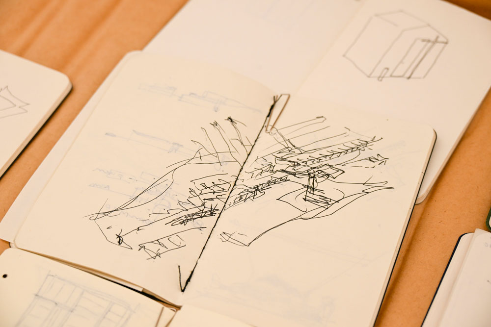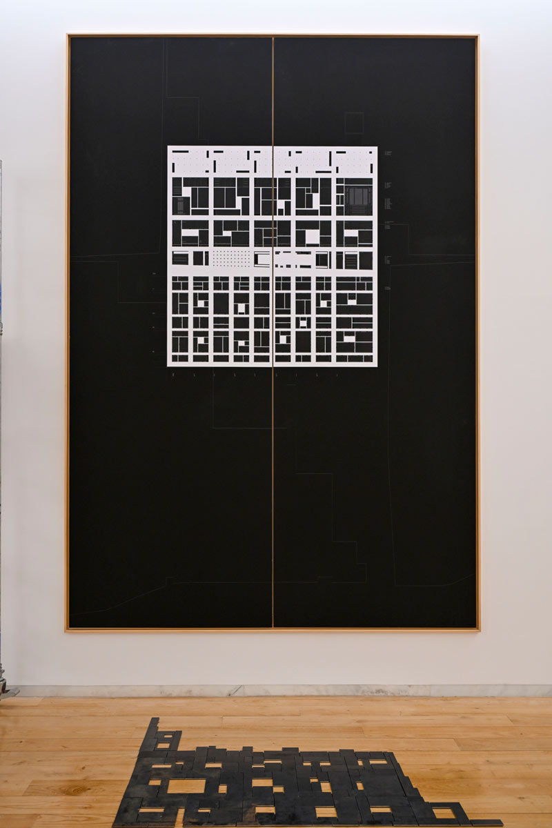 Logo à entrada, uma longa mesa apresenta uma série de cadernos de desenhos como registo contínuo de um pensamento em processo. Na parede sobre essa mesa, uma peça de carácter quase enciclopédico reúne todos os projectos expostos, funcionando como atlas e índice. Mais do que ordenar cronologicamente a obra, este conjunto afirma uma lógica de repetição, variação e método, essencial para compreender o trabalho da dupla.