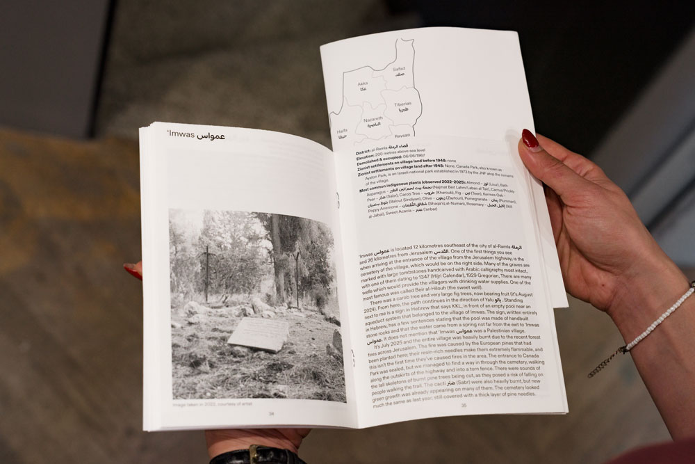 A escritora Adania Shibli dedicou o ensaio A Lesson in the Nature of Resistance (2025) ao pequeno arbusto de alcaparras do jardim dos seus pais, onde passou a infância. O texto breve termina com a imagem de um galho deste teimoso vegetal brotando das frestas da parede do depósito que foi construído no lugar onde existia, mais de trinta anos antes. A insistência vital da planta nos lembra que os seres não-humanos atuam ininterruptamente sobre os espaços e os sujeitos. Entretanto, é comum nos esquecermos deste fato evidente. Assim como o mundo geo-biológico é sempre histórico, a história tem caráter físico – é, também, topografia, paisagem e bio ou cosmogênese: agência em forma material. A exposição All That Remains [2], de Inas Halabi (Palestina, 1988), patente na galeria La Loge, em Bruxelas, é construída precisamente a partir dessa premissa. O título faz referência ao livro homônimo de Walid Khalidi, que leva, ainda, o subtítulo The Palestinian Villages Occupied and Depopulated by Israel in 1948. No início da obra, o autor declara o contexto do seu estudo: o texto convoca a memória da destruição e do apagamento físico dos vilarejos palestinos obliterados em 1948 durante o Nakba – a “catástrofe”, o êxodo forçado de cerca de 750 mil palestinos como consequência do projeto colonialista-sionista de instauração do Estado de Israel – revelando como a paisagem atual ainda guarda vestígios silenciosos desse mundo desaparecido. Khalidi evoca, ainda, a presença de oliveiras e outras árvores frutíferas, cactos e plantas que sobreviveram ou cresceram descontroladamente nessas regiões, declarando que o livro – um esforço impressionante de catalogação com informações historiográficas detalhadas relativas a centenas de cidades – deve ser compreendido como uma espécie de “memorial” a estes locais e pessoas [3]. Em All That Remains [4], Halabi atualiza esta proposta, lembrando que o Nakba é um processo contínuo e salientando, sobretudo, um aspecto perverso da ocupação israelense: a criação, ao longo de décadas, de parques florestais sob administração da instituição sionista criada em 1901 Jewish National Fund (JNF), em territórios onde antes haviam populações e cidades palestinas. As quatro obras apresentadas na exibição foram produzidas enquanto fragmentos do filme em produção The Right of Return [5]. Logo no primeiro piso, perto da entrada da galeria, uma sala à direita nos leva ao Fragmento I. O espaço onde a instalação se encontra é completamente fechado, sem nenhuma entrada de luz. Escutamos sons e vozes enquanto os olhos demoram alguns instantes para perceber as palavras escritas em três paredes. Nos segundos de desorientação visual, adentramos abruptamente no mundo criado por Halabi: uma Palestina inscrita entre o passado anterior ao Nakba, a continuidade deste processo de limpeza étnica no presente, e um futuro em aberto que a artista convida a imaginar. Os textos projetados por três carrosséis de slides são nomes de cidades e aldeias destruídas em 1948 e 1967 por grupos paramilitares sionistas e, posteriormente, pelas Forças de Defesa de Israel (IDF). Além de expulsar, assassinar e violentar seus habitantes, os vestígios físicos das construções foram quase integralmente apagados, demolidos. Os nomes das cidades também foram trocados por outros em hebraico, que não referem os originais. Ao mostrar os nomes originais na ausência de qualquer imagem, a instalação expõe a violência sionista duplamente: na aparente falta de visualidade consequente da destruição, e na própria linguagem – um campo sempre necessário à disputa política; conforme Edward Said afirmou em The question of Palestine (1979), “a simples menção a Palestinos ou à Palestina é nomear o inominável”. Confrontando esta interdição, a primeira obra da mostra explicita seu intuito: a reivindicação do fazer histórico através de imagens e sons, sublinhando que todo fazer da história é, também, um fazer político. Acompanhando a sequência de nomes, ouvimos uma miríade de sons, dos quais vários foram captados no local das vinte e quatro aldeias assoladas que compõem a instalação: o canto de pássaros, jatos militares de combate, vozes e canções tradicionais palestinas gravadas pelo grupo El-Funoun Palestinian Popular Dance Troupe [6] e pela cantora Reem Talhami [7]. Saímos desta sala inebriados pela quase completa escuridão e pela intensidade tanto sensível quanto semântica do áudio. Após a imaginação flutuar entre temporalidades distintas em um movimento de projeção mental daquilo que não é mostrado visualmente, aparecem as primeiras imagens da exposição: ao subir as escadas ao fundo do corredor, nos deparamos com o Fragmento II – fotografias projetadas por outro carrossel de diapositivos. As imagens, aqui, mostram plantas, árvores, bosques: ambientes verdes, de “natureza”. Conforme as fotografias passam, percebemos, em algumas delas, ruínas de pedra e partes de construções. São os destroços das antigas cidades da Palestina, resquícios que precedem a instauração violenta do Estado de Israel em 1948. Segundo a antropóloga Nadia Abu El Haj, a maior expressão do mito sionista de “redimir a terra” – fundamental para o estabelecimento do novo país – é a ocupação do território sob o conceito de Yishuv (cuja tradução literal do hebraico é “assentamento”). Abu El Haj também afirma que o projeto de “fabricação de lugares” é, na prática, uma reconfiguração material e simbólica da paisagem [8]. Sob o pretexto de fazer florescer uma “terra vazia” e árida, o JNF administra mais de cento e cinquenta parques e florestas com nomes tão sórdidos quanto “American Independence Park” [9] ou “Britannia Park” [10], onde estão ausentes quaisquer informações históricas a respeito da sua ocupação compulsória. Halabi expõe de forma poética 