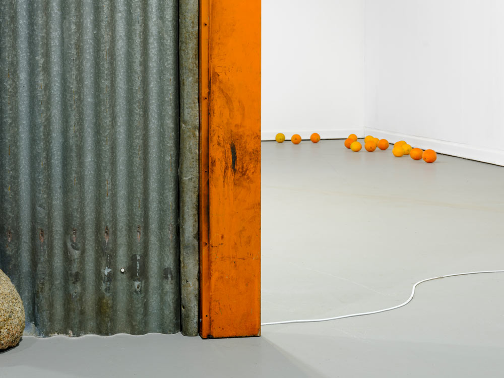 No começo do percurso, Almendra colocou uma estrutura ténue, delgada, sobre o solo, ao centro da sala. Vários materiais, alguns de frágil construção, como chapas onduladas entre outros, assomam, articulados entre si, de modo débil. A estrutura, que aparenta ser uma amostra de um pequeno habitat, um abrigo, ou vedação, foi construída com o recurso a vários materiais reciclados, que terão sido encontrados ao acaso, no campo ou na cidade. Intuímos essas pequenas construções, como os espaços imaginados em que se inserem. Almendra consegue, primeiro, transportar-me para fora da galeria, e depois, fazer-me perceber, através da transitoriedade, a inexistência de barreiras arquitectónicas.