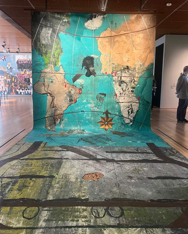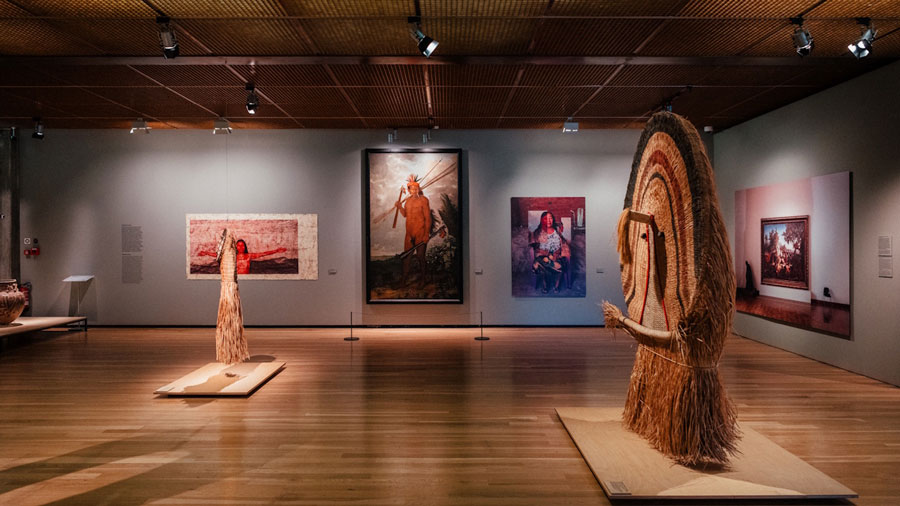 E nesse sentido, complexo brasil, exposição inaugurada na Gulbenkian em Novembro de 2025 com a curadoria de José Miguel Wisnik, Milena Britto, Guilherme Wisnik e projeto expositivo de Daniela Thomas, acerta na dissolução da unidade para revelar a vastidão e diversidade de um país que, valha a contagem oficial, é novo, e conta, com a sua história, uma história que é maior que ele mesmo. Ambiciosa e representativa daquilo que busca convocar, a exposição de 1600 m2 na Fundação Gulbenkian abarca (ou pretende abarcar) a quase totalidade da história e da cultura brasileira por meio de um panorama culturalista de diferentes regiões e fases. Na esteira dos diálogos transatlânticos cuja exposição de Paula Rego e Adriana Varejão é um exemplo, a Gulbenkian dedica dois pisos à tarefa que os curadores se propuseram: narrar o Brasil / os Brasis por meio de uma escolha de obras expressivas. O formato expositivo remete a uma estética antropológica de exposição dos povos: dividido por regiões e/ou culturas, a exposição resvala em um carácter pedagógico e histórico, também porque dotado de um viés culturalista. A imensidão do acervo é impressionante e deve-se também à sua diversidade: pintura, fotografia, instalação, vídeo, literatura, poesia – estão todas lá. De Cláudia Andujar a Clarice Lispector, de Pedro Américo a Denilson Baniwa, Bispo do Rosário a Oscar Niemayer, o Brasil é apresentado pelos melhores espíritos que já passaram por esta terra, revelando uma amplitude marcante de obras e temas. É atravessado, também por isso, pela implicação do passado no presente e dotado de um forte espírito decolonial, sublinhando nas ruínas da história colonial o aspecto bárbaro que existe na suposta civilização. É em uma arquitetura livre e ampla, que convoca o tempo e o caos organizado, que o complexo brasil revela ao mesmo tempo a riqueza e a exuberância da cultura brasileira e sublinha a inscrição e os efeitos do colonialismo nos povos africanos e indígenas, na estrutura sócio-económica do país e na sua psique nacional. Linha norteadora da exposição, a cultura brasileira é apresentada como inextricavelmente produzida/destruída pela violência colonial, pela inscrição material do racismo e pelo abatimento de culturas ricas e complexas por meio da demonização de práticas e povos. Fá-lo por meio de obras às vezes duras e às vezes fantásticas, dividindo sua energia entre a expressão de identidades solapadas pelo colonialismo e a reconfiguração do passado durante o processo histórico. Um exemplo emblemático são os quadros históricos que retratam práticas canibais e que acompanham a consequente apropriação modernista desse imaginário, na década de 20, no campo da cultura. A obra no início da exposição é emblemática do que pretende convocar. Uma árvore/madeira retorcida, obra de Henrique Oliveira, recebe os visitantes à entrada: chama-se O Retorno. O tempo tem caminhos misteriosos e aquilo que fazemos sempre está connosco onde quer que estejamos. A obra, que antecede a primeira parte da exposição, dedicada às culturas indígenas, funciona como uma mensagem a respeito das fleurs du mal plantadas pela cultura colonial no país – e as árvores, plantas, obras, músicas, esculturas, arquiteturas, violências e fracturas que daí surgiram. As obras aparecem, nesse sentido, ora como representações narrativas de uma história, ora como expressões do atravessamento sensível da história e da violência nos corpos artísticos, revelando a constante desconfiguração e reconfiguração linguística, psicológica e física necessária para lidar com a violência que marca a história do país. É o caso por exemplo do Manto de Arthur Bispo do Rosário, peça belissimamente exposta no primeiro piso da exposição. Bordado com palavras, símbolos e números, feito de uma bricolage de tecidos desfiados, o Manto é uma tentativa de reconciliar o eu ao uno, registrando memórias e emblemas em um manto que é continuidade e testemunha de um eu psicótico ou mágico, atravessado por tensões históricas. Foi confeccionado para ser usado, segundo ele, diante de Deus no dia da sua passagem. Tendo vivido anos de sua vida em instituições psiquiátricas, o trabalho de Bispo do Rosário revela não só o atravessamento da religião no seu trabalho, como questiona as fronteiras entre desorganização psíquica, misticismo e violência institucional em um objeto que funciona ao mesmo tempo como proteção e como emblema. De facto, no Brasil, o extraordinário e o cotidiano, a fé e a mendicância, a violência e a cegueira, o canibalismo e a antropofagia configuram uma encruzilhada constante, em que há sempre uma história de histórias, uma estrada de estradas e um tempo cheio de contradições onde pulsa o coração do país. Próximo de fotografias de Claudia Andujar, das histórias do cangaço brasileiro, de cabeças decepadas, do anúncio documental de escravos fugidos e dos esforços ‘progressistas’ de destruição da Amazónia, a exposição é uma panóplia de arte e história, sublinhando a violência estruturante da experiência nacional, bem como a exuberante pluralidade de formas estéticas que se inscrevem na cultura brasileira. Como sintoma, como vingança ou como simples ímpeto criador, as obras apresentadas aparecem sobretudo como uma expressão da história nacional, registro do movimento de dominação, contradição, transformação e metamorfose que atravessou as suas geografias e povos. No meio disto tudo encontram-se também as vanguardas estéticas que se dedicaram a pensar, pintar e construir esteticamente o país – seja o modernismo arquitetónico brasileiro, sejam as vanguardas concretistas e neo concretistas, expostas como poesia e como design – e que revelam as mudanças materiais advindas da segunda metade do século XX bem como o projeto político de dar contorno à identidade nacional por m