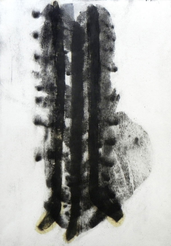 Uso muito pigmento em pó, que não é possível fixar, e que vai ao encontro da desaparição final. Tudo desaparece e é instável. E mesmo na relação com a construção da paisagem, e da imagem, é tudo muito instável. Essa obliteração, ou fuga ou abandono, relaciona-se com essa não fixação de uma coisa. O meu trabalho é também bastante caótico, o que contribui para essa instabilidade. Parece até que é feito por muitas pessoas. Às vezes há cor, e depois não há, e depois há figuração.... e outros desenhos são completamente abstractos. Há uma lógica de fuga a um território. De andar sempre a fugir, de não estar territorializado. O que vem de uma referência teórica. Nem sempre gosto de as referir, porque não as domino. Tenho uma relação diletante com a teoria. Gosto de ter uma luz com e a partir da sua leitura, gosto de as ler, mas não as leio para as perceber verdadeiramente, no sentido de as estudar com profundidade. A minha relação com essa escrita, de pendor mais filosófico, é uma relação imagética também.