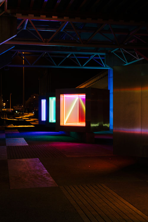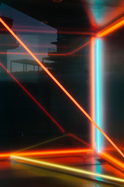 Ao mesmo tempo, no que diz respeito ao alargamento a vários públicos, destaca-se uma outra superfície, caracterizada pela mobilidade, circulação e movimento, o aeroporto Francisco Sá Carneiro. Assim, e de acordo com uma contínua necessidade de desdobramento para novos territórios, Andreia Garcia convidou Gabriela Vaz-Pinheiro para intervir neste não-lugar, tão vivo e ativo. A resposta que se apresenta desdobra-se num contínuo de caixas que parecem ter sido desfragmentadas, separadas umas das outras, e que se estendem no exterior de uma das extremidades do edifício. Com luzes de várias cores, intensificadas e prolongadas através de reflexos nas superfícies de aço inox e vidros, a obra requer uma observação atenta e uma abertura receptiva a um certo encantamento visual. A multiplicação da cor e da forma, condicionada pelo espaço, é também representativa de um entendimento da artista sobre o que o atual tempo, da sociedade do espetáculo, que é composto e dominado por uma acumulação e sobreposição de imagens, formas, informações e comunicações tão excessivas quanto voláteis. É de uma forma também efémera embora prolongada que a obra perdurará em exposição durante dois anos.