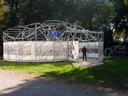 Vale bem a pena transcrever a sua explicação, para os menos entendidos na matéria: “No seu primeiro momento de concepção [Lisboscópio] foi imaginado a habitar e ser habitado no Esedra [?]. Posteriormente, formou-se como unidade de um corpo múltiplo que se fecha para viajar e se abre para mostrar, a ser experienciado noutros lugares. No sítio, Lisboscópio ocupa a sua geografia e redefine um lugar. O corpo-contentor anelídeo constrói-se com tubos, redes, telas e madeiras, reproduzindo-se, recriando-se e aparentando-se, sem alguma vez se constituir como igual. Lisboscópio contém um pulsar sussurrado de uma cidade perscrutada que flúi dentro do seu intricado sistema activo contínuo e fragmentado, comunicante e aberto. O espaço diáfano é ocupado por uma estrutura que se cria como matéria e espaço impulsores da experiência. Na passagem, os momentos de pausa exploram e desvendam uma funcionalidade simples que activa na experiência de habitar uma compressão do espaço e expansão dos sons que se propagam num movimento com desfasamento temporal. Lisboscópio poderá habitar-se como lugar, através de um estar performativo e resiliente, sendo o corpo um espaço da sua experimentação que sugere a passagem como tempo habitado sem territorialização.” [www.trienal.blogs.sapo.pt/20320.html]