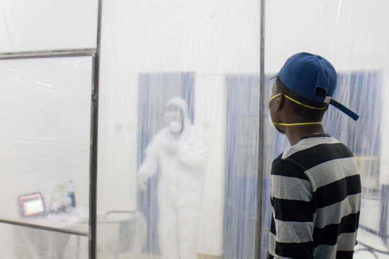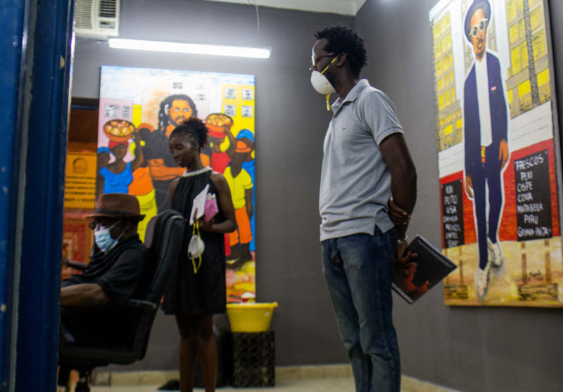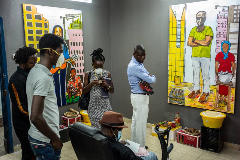 O itinerário continua no quarto 225 onde Thó Simões, em resposta à pandemia global, está de quarentena, comunicando-se com o público através de gestos e mensagens escritas em folhas de papel, procurando a cura da doença num ambiente quase hermético do qual saímos para respirar, sentir, ouvir e ver, no 227, a curta-metragem e instalação de Indira Grandê, Catumbela das Conchas, que nos transporta para a história de uma criança que se perde e cuja odisseia, até ser encontrada, se interliga com os trajectos do comboio e o imaginário das tradições, sons, natureza e história da região da Catumbela, levando-nos a reflectir sobre os nossos próprios caminhos e destinos e o destino do país, onde poderemos todos estar perdidos e achados. Entre as palmeiras e a areia vermelha, a criança fica encalhada entre uma perca que até poderia ser a de um turista e a evidência de que não seria assim tão difícil que, perdido e desamparado, a sua vida se transformasse em pó. No 228, a instalação de Rui Magalhães em Paralelo Zero examina distopicamente os bairros da nossa cidade, que desumaniza pelo betão e se alimenta da incompatibilidade entre a avidez por recursos e a sustentabilidade da vida humana, produzindo fenómenos sociais e urbanísticos que perpetuam a fragilidade das mentes e a colonização dos corpos. E, ao desfrutar da instalação deste artista, as garrafas de cerveja à volta das suas imagens terminam sendo indícios do carácter devastador do alcoolismo, na sociedade angolana. No quarto 229, a vídeo-instalação de Verkron propõe uma saída: uma revolução psicológica baseada no desconhecido - desconhecido esse que se materializa nas nossas mentes quando largamos a percepção de habitarmos uma única realidade e aceitarmos como realidade INCVBVS, que projecta a nossa própria interpretação daquilo que vemos: é a realidade ritual vivenciada na hora. O espectador intrépido fica situado, então, entre a consciência da omnipresença da vídeo-vigilância e o pesadelo ao constatar de que tudo poderá ser gravado, retransmitido e vivido, mais além do passado, do presente e do futuro que definiam antes a sequência do tempo. E, na senda de explorar realidades, é imperativo parar no 230, na instalação de Muamby Wassaby, WALÁLÁ S.A. - o espanto causado pelos cofres vazios depois do boom económico impulsionado pelo preço do petróleo que ditou o surgimento de um todo-poderoso e impune ‘empresariado das sociedades anónimas’, transfigurado eventualmente em desvios massivos do erário público, dantes referidos por ‘acumulação primitiva de capital’, hoje por ‘crimes económicos’ - uma prática que o artista avisa ser… viral. A cruz que o artista monta com caixas do Banco Nacional de Angola para transportar dinheiro traduz a ironia e o desconcerto do cidadão. As caixas transformadas em bancos de uma congregação convidam a um momento de reflexão sobre as ‘ordens de saque’. À esquerda, o espectador começa no quarto 222, onde a instalação de Flávio Cardoso, ALiEN, faz um diagnóstico da ‘mundividência eurocêntrica mediada pela televisão, por computadores e pela Internet’ em que a comunicação audiovisual da noite, dos espaços vazios, fachadas cintilantes, estruturas metálicas, superfícies de betão e iluminação néon edifica uma narrativa distópica que visa questionar a ‘sustentabilidade dos mecanismos vigentes de globalização’ num país ‘distanciado do seu potencial económico e da sua própria diversidade cultural’. Avança para o 231, onde Kiluanji Kia Henda com O Estado da Nação, o artista que se vai assumindo cada vez mais como “um político”, mostra-nos um quarto, literalmente, de “patas para o ar” como se, com isso, quisesse emular a ideia de desconforto, de disrupção e de permanente caos em suspensão, seguido por Iris Buchholz Chocolate no quarto 232, que transforma as rotas e relatos das viagens de um etnólogo alemão entre os povos Ngangela, na era colonial, numa instalação e performance iluminada que executa rituais para curar os espíritos e a história em kuthaka mahamba, reencenando práticas femininas e almejando a partilha e descolonização de conhecimentos. São belas e impactantes, as imagens das mulheres a passearem pela cidade, que ela privilegiou para a sua performance, com as suas coroas iluminadas como se não houve violência doméstica, nem disparidade social e económica de géneros em seu desfavor: carregam luz na cabeça como antes outras carregaram balaios ou como todas, habitualmente, carregam vidas. No 233, Pedro Pires diz ‘NÃO’ em Sim, ressurgindo o valor e o poder único da recusa na esfera social e política, num protesto implícito contra a habitação precária da vasta maioria das populações urbanas. Mas, é na incomodidade e na incapacidade de perceber o que vemos, de saber exatamente onde estamos, e onde vivemos, que essa recusa se transforma em manifesto: negar as evidências é, então, uma declaração simplesmente retórica, nunca a afirmação da resignação e do abandono. As letras passam a ser uma escultura composta por vários módulos, um objeto com que gozamos fruindo com ele. O espectador termina no quarto 219, onde Mestre Kapela conversa com a tela e o público em Cidade Poto Poto, revivendo os seus encontros mais marcantes na capital, e os anos na UNAP, pelo olhar e pincel da sua escola de arte preferida, que moldou as práticas e técnicas da sua longa e prolífica carreira. A instalação e a performance - em que Kapela pinta ao vivo - constituem o único diálogo intergeracional desta edição, um diálogo entre as duas escolas e num apelo ao pé de igualdade, na arte contemporânea angolana, das pinturas feitas nesse estilo, que são, largamente, relegadas à categoria de artesanato produzido para turistas. Porém, ao que nos parece, desta vez, as pinturas de Kapela têm algo diferente: documentam o seu encontro com alguns dos 