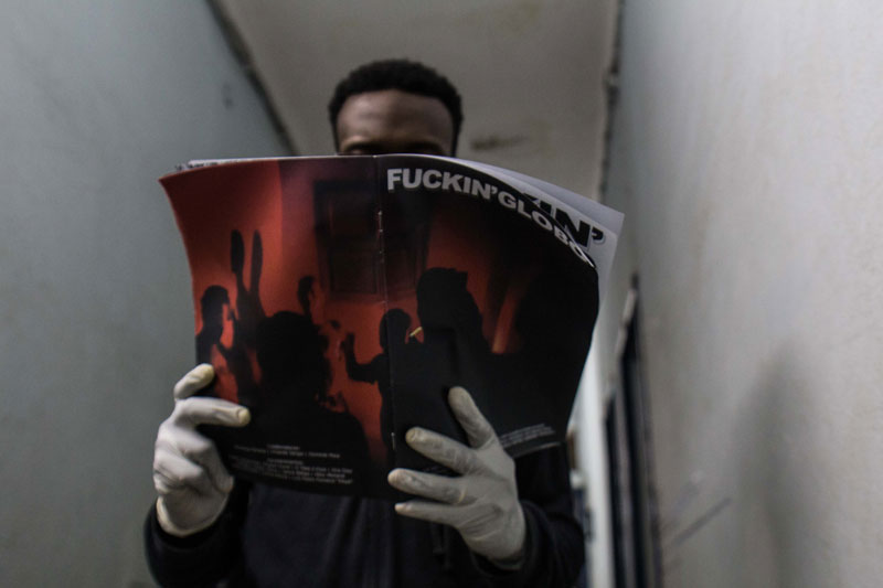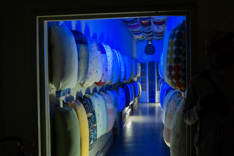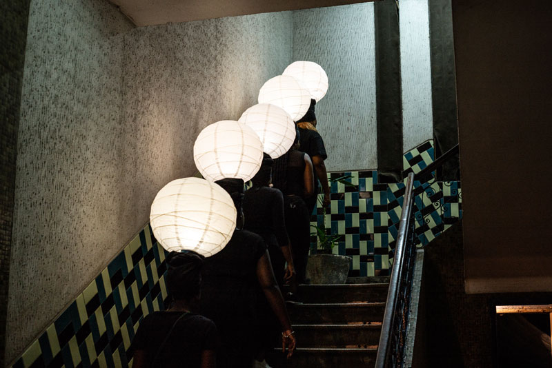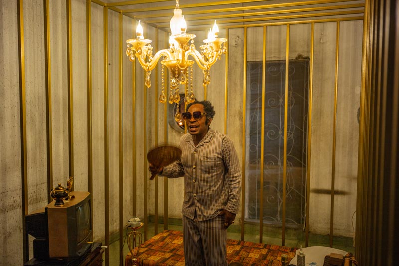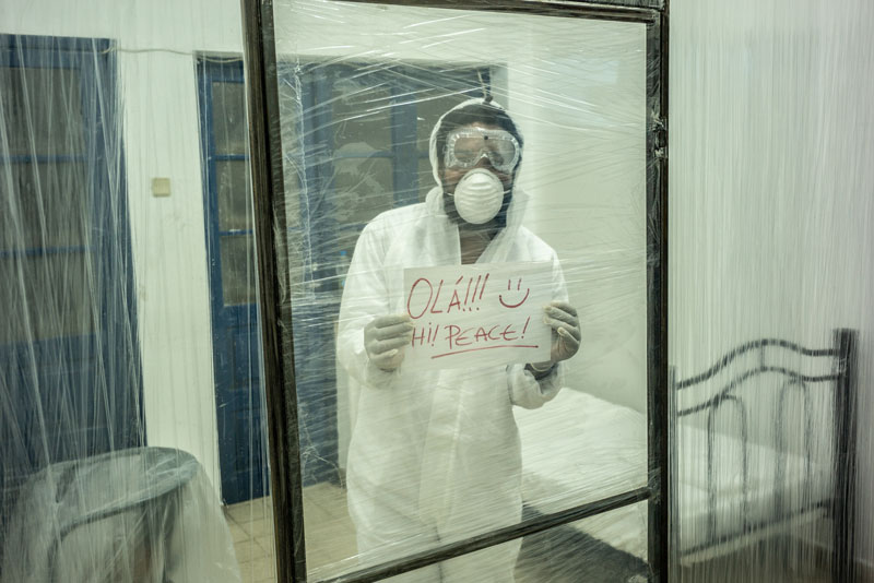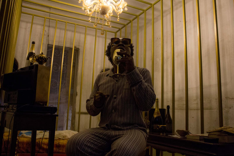 E não é difícil reconstruir o percurso que fizeram: a viagem começa no corredor do primeiro andar, à direita, onde a instalação de Toy Boy sugere que o conforto pode estar em qualquer lugar ou em sítio nenhum. Abrindo um caminho no silêncio das nossas dúvidas, Silence convida-nos a explorar corporalmente – apalpando, se encostando ou vendo – onde se encontra este lugar. Uma performer com burka entre aquelas almofadas é das imagens que nos ficarão na retina. À esquerda, no mesmo andar, um personagem se debate com a ausência de narrativas internas na curta-metragem Enóquio que não tinha coração de Ery e Evan Claver, que mergulha nas profundidades da alienação mental, retratando as experiências de um jovem desamparado que erra, sofre e se redime na atmosfera frenética das altas horas da noite. No segundo andar, a primeira paragem é no átrio, ante a instalação de Mussunda N’Zombo, onde, ao longo dos 7 dias da exposição, o espectador poderá rodear a proverbial ‘gaiola dourada’ e acompanhar a encenação de todos os estágios do encarceramento de um dirigente corrupto em Nguvulu, Marimbondo. Desafiando as nossas percepções do bem e do mal, personificando os vícios, o absurdo, o paradoxo, a soberba e a masculinidade tóxica do mundo dos homens poderosos, a performance vocaliza a mentalidade voraz dos acusados, disseca o tratamento judicial desses casos e a volatilidade da opinião pública perante os ‘prisioneiros de luxo’. Em seguida, o espectador pode escolher se vai para a direita ou para a esquerda. À direita, o percurso inicia no quarto 223, onde Melancholia, a delicada instalação de Keyezua, aborda a questão da sexualidade feminina durante o acto sexual, olvidada pela primazia do pénis, que domina o acto em detrimento do prazer sexual da mulher: a sua instalação é uma metáfora subtil que podemos não entender imediatamente. No 224, Yola Balanga encena silenciosamente o acto de lavar poucas horas antes a roupa escolhida como ‘a eleita’ para vestir, relativizando as propagandas governamentais ao Sukula Zwata (Lavou, Vestiu), usando o acto e o tanque de lavar roupa como meios de crítica às desigualdades sociais e o fracasso das políticas do governo para a sua resolução. Mas é, sobretudo, a presença dos tanques de lavar de cimento nos quintais dos bairros suburbanos ou, muitas vezes, nas varandas dos prédios da cidade, o elemento que contém a memória da vida de muitas famílias.