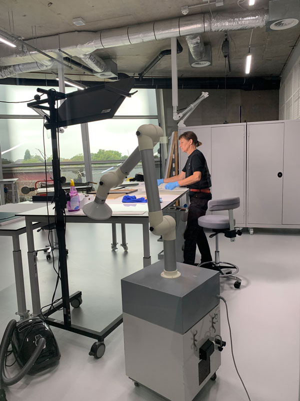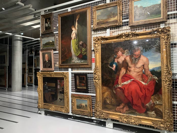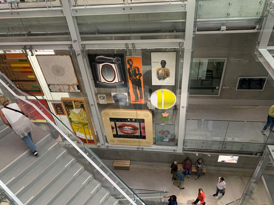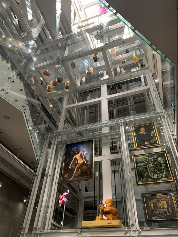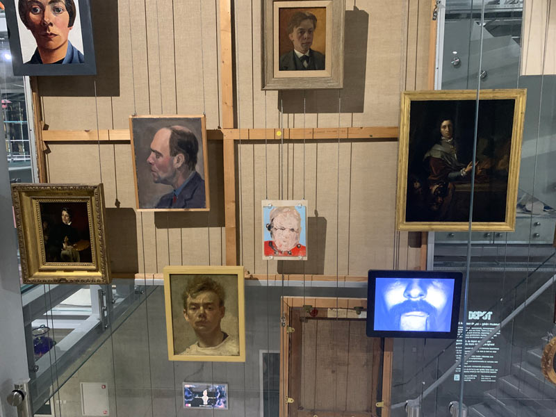 Um edifício de seis andares planejado pelo escritório de arquitetura holandês MVRDV, e totalmente dedicado a expor o acervo do Museu Boijmans Van Beuningen: o chamado “Depot”, foi inteiramente construído em metal e vidro e permite aos visitantes entrar em contato com as obras de arte da coleção de diversas maneiras: através de “vitrines” que expõem as estruturas tradicionais de reservas técnicas de museus para abrigar obras de arte mas não só, também em painéis de vidro com pinturas suspensas ou ainda “pontes de vidro” que cruzam o espaço e nos permitem “passear sobre a obra” e, no caso de obras contemporâneas – como por exemplo o trabalho de Maurizio Cattelan, “Untitled” (2001) – através de uma estrutura em vidro especialmente projetada para abrigar aquela obra. Uma das salas, dedicada aos highlights da coleção, apresenta as pinturas em cavaletes de vidro, cuja inspiração, a partir do trabalho da arquiteta Ítalo-brasileira, Lina Bo Bardi, é referida em um vídeo que documenta uma visita técnica ao Museu de Arte de São Paulo (MASP), no Brasil, local onde os cavaletes de vidro foram originalmente projetados no final dos anos 1960. Os vídeos espalhados pelo edifício frequentemente focam sua narrativa em pessoas ligadas ao staff como, por exemplo, o guarda Renzo van Riemsdij. Graduado em música, Renzo trabalha como engenheiro de som em seu próprio estúdio durante o dia e como segurança no Depot Boijmans pela noite. O trabalho dos conservadores é apresentado e destacado pela visão oferecida pelas paredes de vidro que permitem a visão dos laboratórios, nos quais os visitantes podem observar o trabalho sendo executado pelos conservadores, rodeados de todo o equipamento técnico necessário à função. Tendo em mente que a experiência de um Museu é orientada, em grande medida, pela visão, aqui o contato visual adquire uma nova camada, uma camada voyerística: a experiência de ver aquilo que está escondido ou por trás da obra de arte – dando uma espiadela no trabalho que é desenvolvido nas obras e, obtendo um vislumbre através de um ângulo, uma janela – está em toda a parte e tudo colabora para uma experiência de um escrutínio máximo da obra. E com isso uma irresistível intimidade é promovida, de onde advém o acento voyeurístico. Tal sentimento é reforçado pela visão das etiquetas atrás das molduras das pinturas. Em um certo ponto, eu me encontrei observando escrupulosamente estas etiquetas, que são colocadas na parte de trás da moldura de uma obra cada vez que ela participa de uma nova exposição em outro Museu. A sensação era a de estar a ler a biografia daquela obra de arte específica.