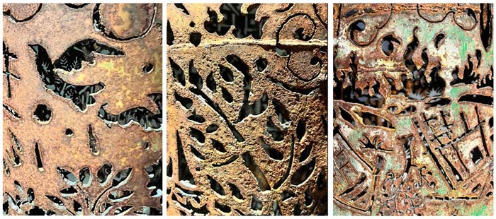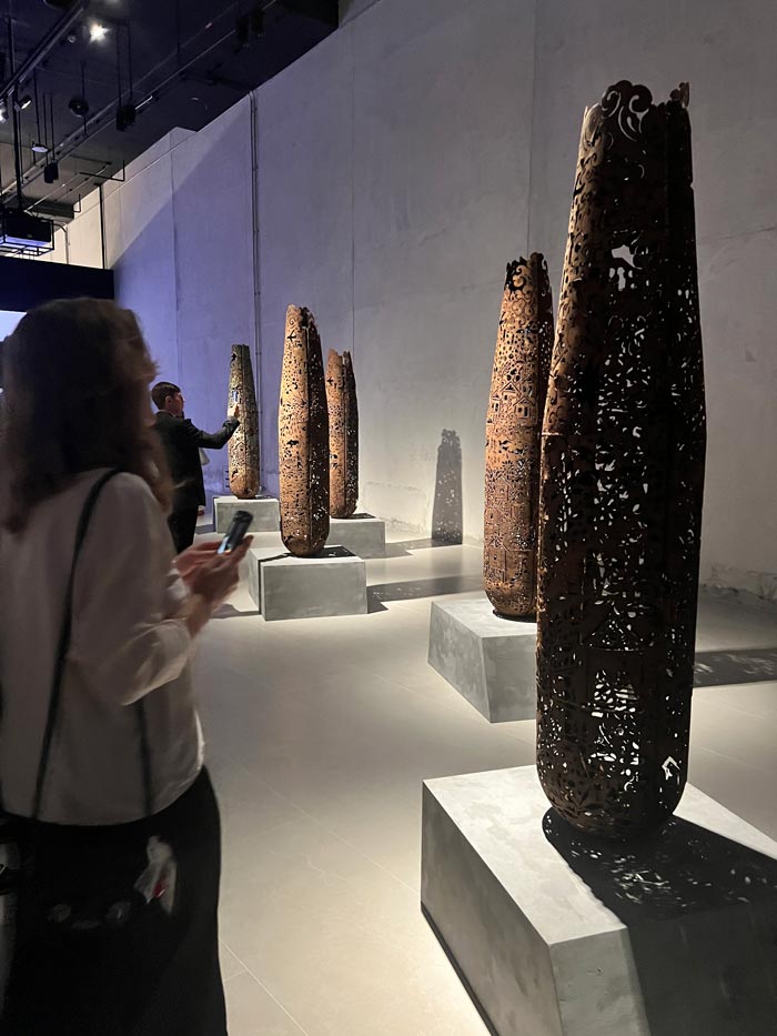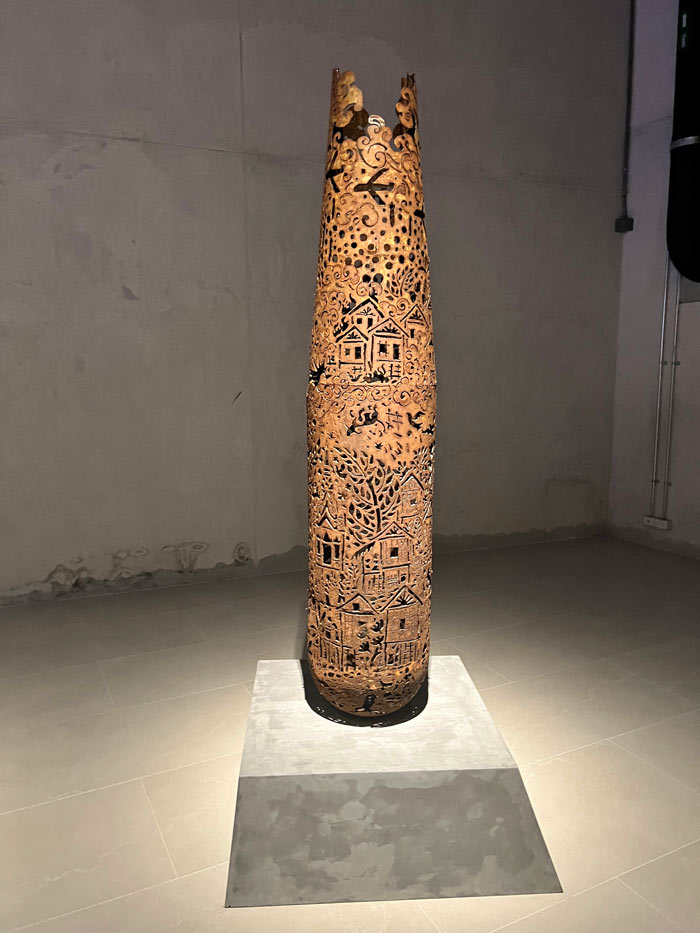 Outras fronteiras artificiais com a natureza, deste vez entre o Homem e os animais, foram o tema da instalação vídeo da americana Jessica Segall. (FIG.5) Intitulada (un)common intimacy (2018), a peça, exibida no templo Wat Prayoon, mostra um encontro pacífico entre uma mulher (a artista), um crocodilo e um tigre. A sua interacção numa piscina contradiz o medo comummente associado a estes predadores. Segall advoga que a acção humana limita a vida dos outros seres, e que o medo do mundo selvagem está na origem da destruição dos ecossistemas ao mesmo tempo que mantêm a humanidade alienada da natureza. Este tema da alienação dos humanos em relação à natureza é também abordado na obra do artista do Laos Bounpaul Phothyzan, Story of the Plateau (2019). (FIG.6) O conjunto de estruturas fálicas lembra os menires do passado, profusamente decorados. No entanto, estes objectos são restos de projécteis de bombas da Guerra Americana (1959-1975). Menos conhecidos do que os do vizinho Vietname, os bombardeamentos do Laos foram mais severos e deixaram um rasto de contaminação do solo naquele país, situação ainda não resolvida. O artista promoveu uma recolha destes despojos de guerra nos campos agrícolas do Laos e neles ilustrou e narrou a luta contínua do povo do Laos contra a destruição do seu ecosistema. A contaminação por plástico, também um problema global, foi o tema da instalação One Eyed Rangda (2023) do artista indonésio Ari Bayuagi. Esta composição evoca as reservas de museus etnográficos, cheias de objectos suspensos. Mas estes são novos objectos, tecidos pelo artista com a participação das comunidades locais e feitos a partir de resíduos marinhos encontrados nos mangais e praias de Bali. Alguns artistas também abordaram a forma como a vulnerabilidade dos ecossistemas molda o nosso futuro colectivo. A artista britânica Susan Collins apresentou Rising Tides (2024), uma obra fotográfica alimentada por imagens pixelizadas da paisagem ribeirinha de Bangkok e Londres, captadas por câmaras instaladas nas margens do rio Chao Praya e Tamisa. A obra examina e compara as aparentemente subtis alterações das marés nas duas capitais ao longo de um ano. A artista revela uma grande diferença: enquanto Bangkok apresenta uma vulnerabilidade muito acentuada, Londres mantém-se estável devido à construção da barreira do Tamisa. No mesmo registo, o artista irlandês George Bolster concebeu a tapeçaria em forma de panorama The Impermanence of Protection: Big Bend National Park (2023). Nela, chama a atenção para a despromoção do parque nacional Big Bend nos Estados Unidos, na fronteira texana entre os EUA e o México, para alertar o público para a crise ambiental em curso. Nurture Gaia revela desequilíbrios entre a humanidade e a natureza, ao mesmo tempo que nos recorda que a cultura pode conter respostas importantes. Os artistas investigaram os legados do passado, a cultura material, as acções e crenças humanas de forma a transmitir mensagens que contribuam para o movimento global de activismo ambiental. Ao fazê-lo, Nurture Gaia, a 4.ª edição da Bienal de Arte de Bangkok, responde à vontade das novas gerações e dos artistas saturados com a inacção climática.