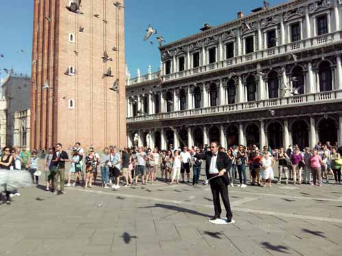 Quantos turistas e quantos venezianos já terão visto um único maestro a dirigir as 3 orquestras? Quantas vezes as 3 orquestras se uniram? Quantas vezes os 3 cafés se uniram? Ao desconstruir o modelo turístico estabelecido, associando cafés e respetivas orquestras, as regras numa das mais bonitas praças do mundo são, por 20 minutos colocadas em standby e infringidas pelo encanto do sinete arrepiante de Michael Stabb, que nos leva ao centro da praça introduzindo o maestro à sua maestria.