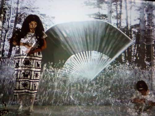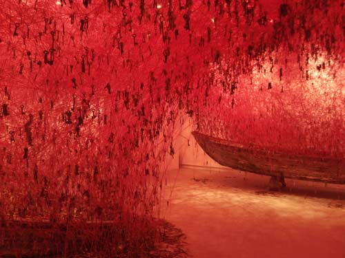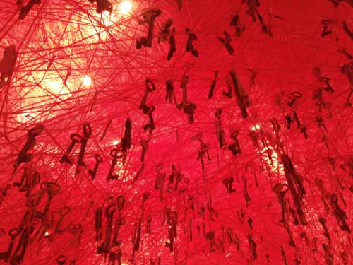 Um emaranhado de fios cor de sangue, entrelaçados geométrica e esteticamente com uma minúcia inebriante, de onde pende uma chuva de chaves de todas as idades, é o inevitável encanto do pavilhão Japonês. Circuitos de ADN foi o que, num coup d’oil, me pareceu ter visto ao entrar neste espaço. Seguiu-se a descoberta de que, curiosamente, há uma obra anterior da artista, que data de 2004, intitulada Dialogue From ADN.