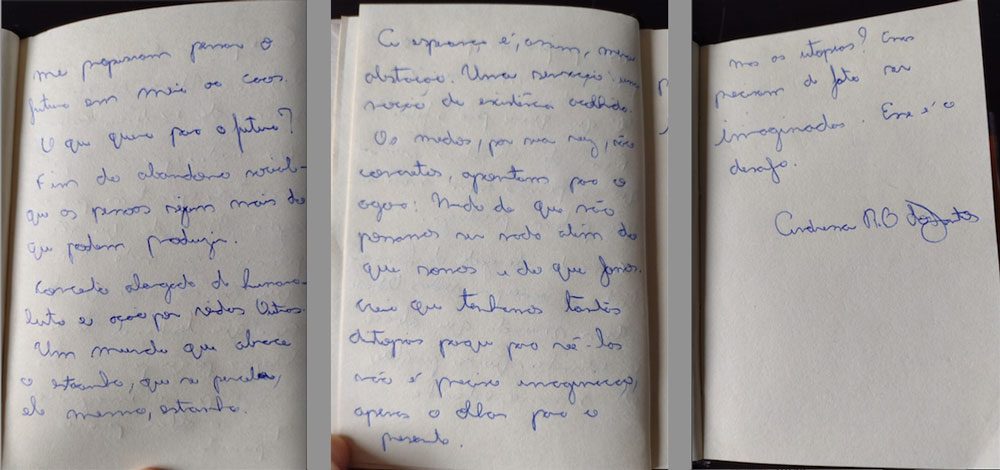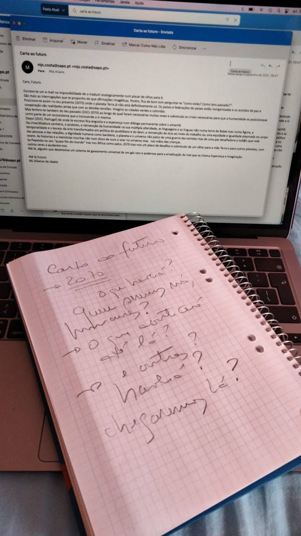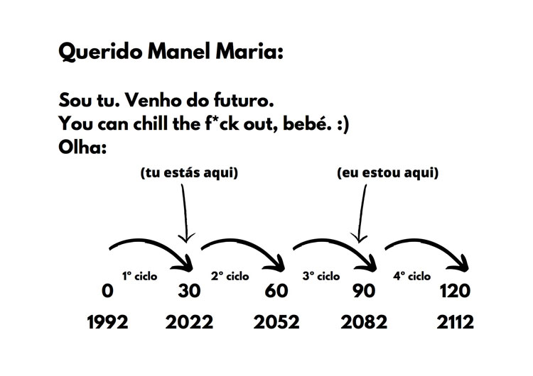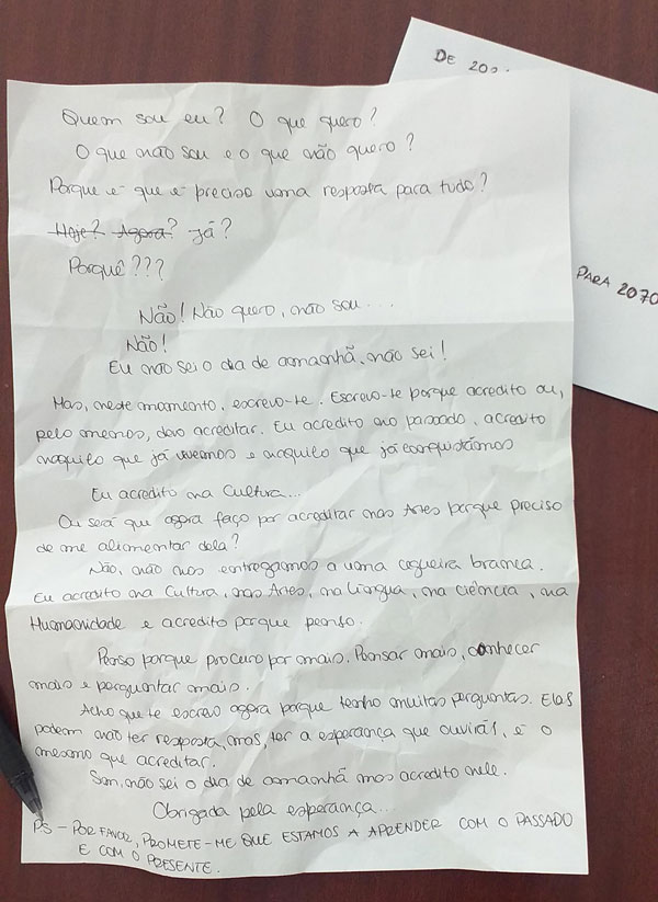 Os serviços postais de e para o futuro trabalharam horas extraordinárias nestas meditações sobre o tempo que ainda aí vem. Beatriz Gonçalves desabafa as suas ansiedades numa carta sobre a esperança na aprendizagem com erros antigos para um futuro com menos injustiça social. Catarina Pratas instiga a conhecer mais, pensar mais, perguntar mais. Maria José Costa dialoga entre o agora e o depois, e entre o analógico e o digital, dando voz a um optimismo céptico. No sentido temporal inverso, Manuel Maria Costa recebe uma carta do seu ‘eu’ futuro, sob a forma de desenho digital, trazendo boas novas de uma vida comunitária plena, intergeracional e interseccional, em perfeita comunhão com o planeta. Num exercício de escrita por associação livre, acompanhado do seu testemunho em voz própria, Andressa Bissolotti dos Santos discorre sobre ser mulher lésbica no Brasil de hoje, o envelhecimento LGBTI+ e a possibilidade de residências sénior inclusivas, numa luta entre medos presentes e possibilidades do amanhã.