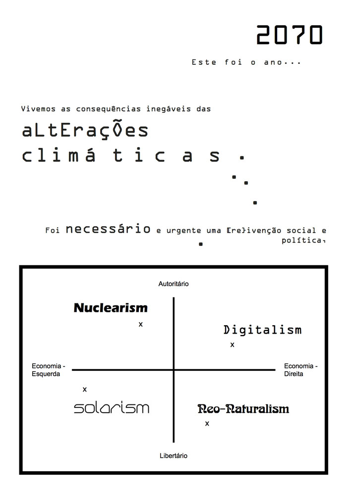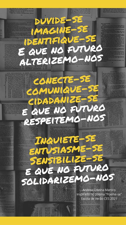 No contexto atual, pautado pelas alterações climáticas, emergências de saúde, ascensão de movimentos populistas e conservadores ou guerras e ameaça nuclear, imaginar um futuro justo pode ser considerado um acto transgressor. Foi mesmo esse o mote da Escola de Verão CES ‘Reacender a imaginação cívica para a mudança social’ (junho de 2021) e para a exposição virtual com o mesmo nome, que ficou disponível ao público em junho de 2022. ‘Imaginação cívica’ refere-se à capacidade de imaginar alternativas às condições culturais, sociais, políticas e/ou económicas contemporâneas. A pesquisa sobre a imaginação cívica (Jenkins et al. 2020) tem criado um espaço onde as humanidades se encontram com as ciências sociais para, juntas, explorarem as consequências sociopolíticas das representações culturais e as raízes culturais da participação política. Nesse processo, cria-se a necessidade de (re)pensar a nossa voz enquanto agentes políticos de mudança e a forma como entendemos e sonhamos as relações com outros/as, humanos e não humanos, e com o planeta Terra; e de reimaginar como vivenciamos a liberdade, o respeito e a democracia em momentos desafiadores em que esses direitos nos são negados. Ao longo de uma semana de Escola de Verão navegámos por essa imaginação cívica através da investigação académica vinda de vários contextos geográficos, escutámos discussões em mesas redondas com artistas e ativistas de diversas áreas e organizações de base comunitária sobre o clima, as artes e cultura ou a saúde mental e realizámos de workshops em que pensámos representações do futuro feitas pelo cinema mainstream e discutimos formatos, meios e o alcance da forma como, enquanto académicas, comunicamos ciência social para diferentes públicos. Ao longo de todo este processo, a articulação entre a teoria e a prática, assim como da história pessoal de cada participante, foi tão evidente como essencial. A exposição virtual ‘Reacender a imaginação cívica para a mudança social’ resulta precisamente dessa reflexão crítica e também autoetnográfica levada a efeito durante o período da Escola, mas com muitas reverberações para além dela. Através de várias linguagens artísticas e de comunicação – escolhidas por cada participante e buriladas pela curadoria da exposição – este conjunto de onze obras constitui um olhar carregado de dúvidas e receios de quem já sentiu na pele a injustiça social, mas também de desejos e afectos, construindo um verdadeiro caderno de encargos para as lutas civil e social, climática, cultural e identitária que resultarão num mundo mais justo daqui a meio século. Logo no arranque da exposição, Isabella Alves vai direta ao assunto escrevendo a pastel de cera numa folha já usada – ou seja, fiel depositária de outras histórias e camadas de significados – um apelo à resistência pela possibilidade de todo e qualquer tipo de existência. Em cinco cartazes, Tiago Mindrico elabora sobre a muito necessária reinvenção social e política decorrente do contexto de emergência climática. Passaremos a ser uma sociedade digital com todos os dispositivos ligados em rede, gerida pelas forças de mercado; com o nuclear como fonte de energia, que leva a pouca população existente a viver sob uma cúpula, sem poder olhar o céu; dependente da luz solar e que cria a sua própria comida e ferramentas DIY; ou de total oposição a sistemas tecnológicos para centrar na natureza a resposta para a coexistência saudável com as outras espécies do planeta? Do individual para o coletivo, Andrea Martins reflete sobre os temas da Escola de Verão e faz uma chamada para a acção através de um poema. Juntando um vídeo a um comentário áudio, e tendo o Brasil como foco, Mayalu Matos imagina futuros justos e dignos que rompem com o ciclo de violência intergeracional e de desigual distribuição de riqueza. ‘Nonada’, palavra oferecida por João Guimarães Rosa em Grande Sertão Veredas, é o mote para uma reflexão em modo de fragmento poético, montagem de palavras e ilustrações de Renata Motta. Marta Ferraz usa o cartaz/colagem para ilustrar um momento futuro em que existirá um melhor entendimento e aceitação da neurodiversidade nos seres humanos, como potência e não deficiência.