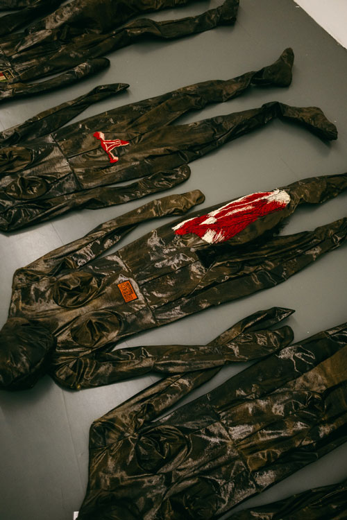 Ainda além disso, a exposição tem um tom sarcástico, quase tragicômico. Os corpos carbonizados, em vestes de proteção para motocicleta, dispostos enfileirados de frente a uma parede branca, aparecem não de forma dramática — não há aqui excesso de emoção – mas como facto ou evento; dispostos como motocicletas ou como cavalos de brincar; como parte de um todo que rasga o globo ocular da visão doméstica das coisas. Tudo tem peso e, ao mesmo tempo, ácida leveza. Talvez este seja o grande feito de Bircken, aquilo que a torna uma artista tão relevante no cenário contemporâneo europeu. Tudo é leve — mas tudo é bastante sério. E nesse equilíbrio, fabrica-se, como se fabricam têxteis e textos, a produção de Unheimlich, o estranho familiar. A questão aqui são proximidades e afastamentos; aquilo que está no passado e é revisto no presente; o que está acolá e, pela força de uma fronteira ou de uma linha, passa para cá. A questão é a costura das coisas. E as linhas. No final, cabe-nos sobretudo observar a força das alegorias advindas dessa composição.