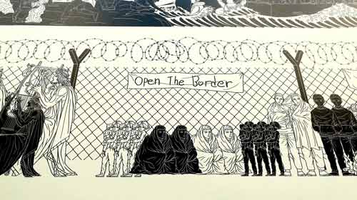 A menção a esta obra serve unicamente como referência, para que possamos com algum termo de comparação, analisar o que está a ser mostrado neste momento nos Estados Unidos, como arte de influência política ou de protesto, e que associamos indubitavelmente a um período que todos estamos a atravessar. Quero também antecipar que não tenciono com esta analogia fazer um julgamento estético ou menosprezar o que está a ser produzido e apresentado como forma de expressão artística, nem categoriza-lo em nenhuma corrente. Como já mencionei, o momento está em curso e como observador estou a registar algo que me parece relevante e a comentar fatos que não são alternativos e aparentemente também não serão subjetivos.