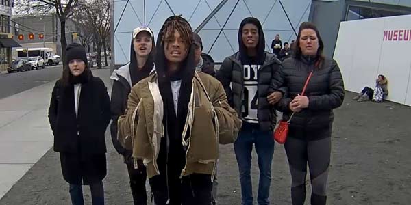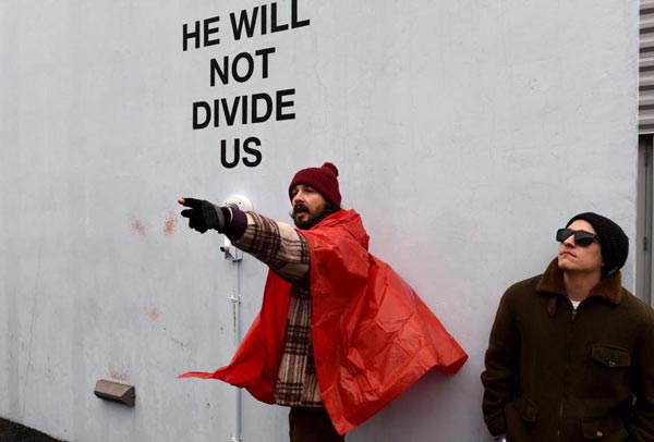 Houve um outro trabalho que gostaria de destacar e que acabou por passar despercebido também em Nova Iorque, eventualmente pela sua localização no Museum of Moving Image em Queens. A instalação “He will not divide us” dos artistas LaBeouf, Rönkkö & Turner, convidava qualquer transeunte a proferir as palavras “He will not divide us” para uma câmara montada na parede do Museu e que registava as imagens no exterior. O público podia da forma que entendesse, o número de vezes que quisesse, dizer a frase para a câmara, que emitia em livestream todos os atos, 24 horas por dia e 7 dias por semana. Esta instalação que teve início no dia 20 de Janeiro de 2017 e que deveria supostamente manter-se pelos quatro anos do mandato do Presidente, foi no entanto removida pelo Museu no passado dia 10 de Fevereiro, por alegadamente estar a incitar a atos de violência e desordem no bairro. Os autores publicaram no seu site que o Museu os tinha abandonado.
