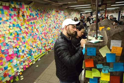 Um outro trabalho que também se tornou viral, foi a espontânea obra que marcou os dias e semanas seguintes à eleição, em Nova Iorque, e que recolheu declarações de mais de dez mil pessoas num reflexo emocional de protesto e indignação. O projeto “Subway Therapy” do artista Matthew “Levee” Chavez, convidou qualquer pessoa que passasse na estação de metro da 14th street-Union Square, a colar o seu post-it nas paredes expressando os seus pensamentos, ansiedades, palavras de felicidade e esperança. Como resultado, criou-se um poderoso discurso da população de Nova Iorque que é particularmente compreensiva, inclusiva e sensível, no que respeita à aceitação da diferença e da singularidade do ser humano. Este trabalho acabou por ser removido pouco antes do Natal, para puder ser arquivado na New York History Society.