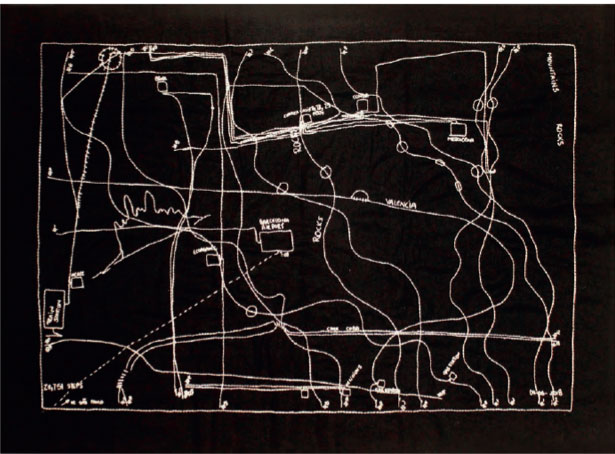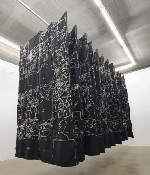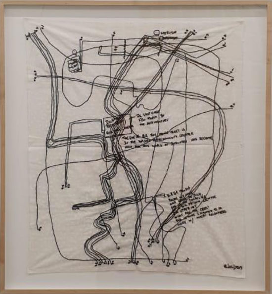 Ao apropriar-se da existência e do tempo, Ana Amorim oferece uma reflexão muito maior em sua atual exposição do que, creio, poderia ter logrado, caso não fizesse de sua poética uma profissão de fé e um testamento da contemporaneidade pela simples materialização minimalista de suas ideias. Assim, desvela ao espectador um jogo de interações em que tão importante quanto o ato da criação, é o ato da interpretação em campos abertos, como sugere Bourriaud (id, ibid): “No quadro de uma teoria ‘relacionista’ da arte, a intersubjetividade não representa apenas o quadro social da recepção da arte, [...] mas se torna a própria essência da prática artística”. Numa etapa seguinte de seu projeto, Ana Amorim passou a transferir seus mapas desenhados para tecidos que seriam bordados pela própria artista, a seguir, o que pode ser lido como um processo de fixação e consolidação de um método, com vistas a uma reificação de paisagens mentais, agora eternizados num material menos perecível e mais acessível. Há uma longa série desses trabalhos, que compila em extensos cortes de panos pretos os mapas realizados no decurso de anos inteiros, como a peça First Embroidery, uma reunião de memória, arte e evolução técnica para além da mera objetificação de uma ideia, já que isso não daria conta do complexo jogo fenomenológico que envolve seus processos. De maneira mais direta, como escreveu Maurice Merleau-Ponty,