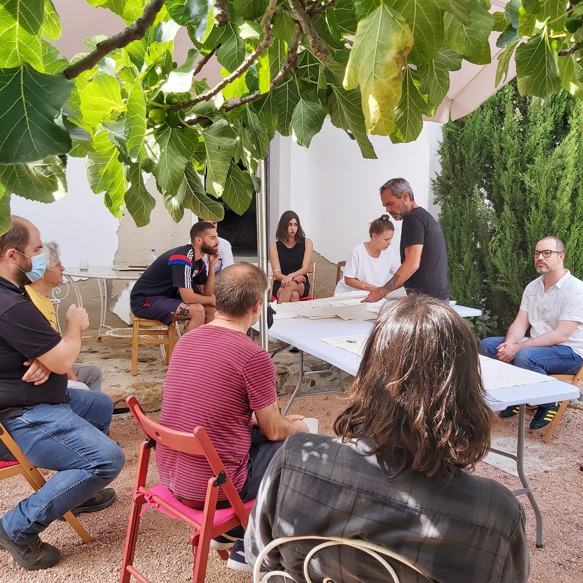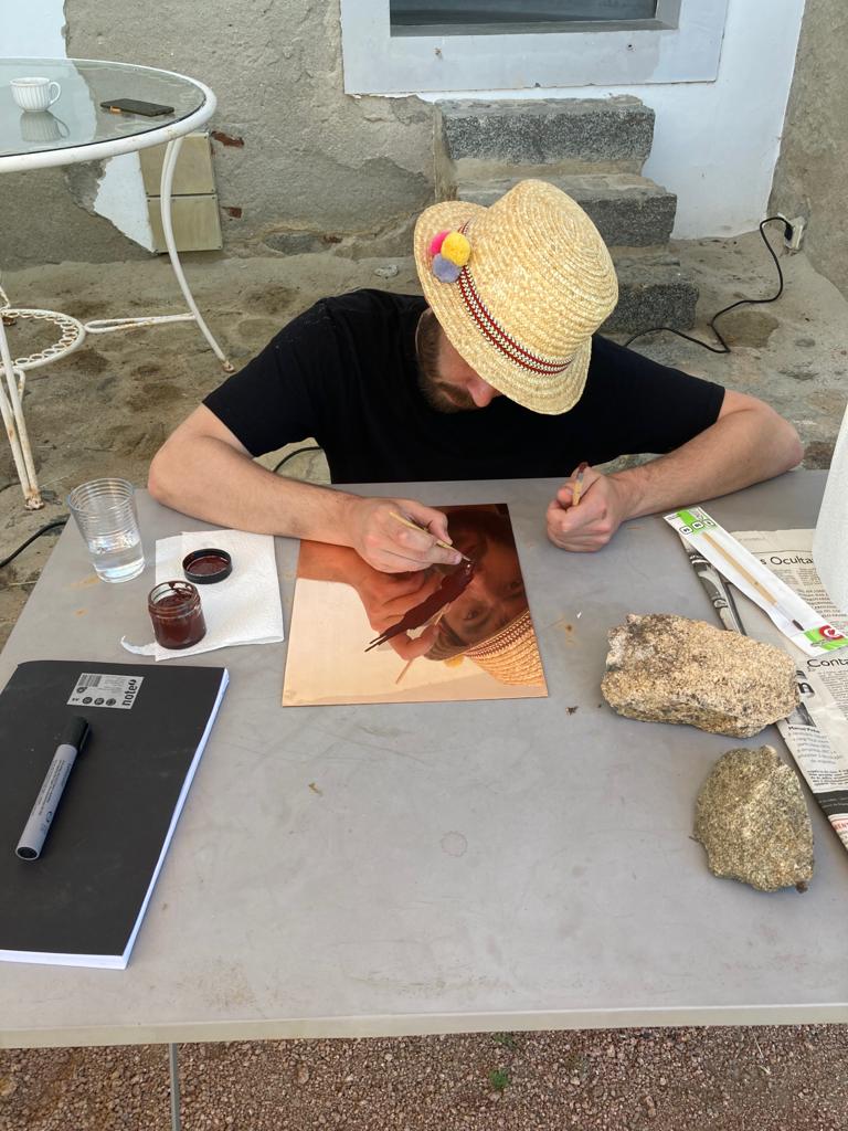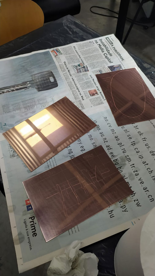 Escolher o lugar do discurso para descrever uma experiência de trabalho que se interliga com os vários estares - das técnicas, dos artistas, e também dos projectos que se interligam - é um exercício ambíguo: onde deverá estar a minha voz? Se relato algum poderá ser neutro - porque o ver está cruzado com os olhos - o relato onde para além dos olhos se encontra o corpo, e no corpo, o trabalho... como poderá acontecer? Para que a monopolização desta partilha seja mais moderada, tentei-me conter na minha colocação, que já cá estaria de alguma forma, pelo que a voz talvez seja vacilante e dialogue com a proximidade com as pessoas. [Qual será, de facto, a distância da pessoa ao artista...?] Divaguei no levantar de questões em que posso pensar a partir da experiência: O que ganham os artistas - perdão, os pintores! -, em estar juntos em períodos curtos de tempo (no caso, a residência organizou-se em duas semanas de trabalho, cada uma delas dedicada a uma das áreas das técnicas de impressão) para desenvolver trabalho artístico? E o que ganham as áreas disciplinares em serem ocupadas - ou absorvidas - neste modelo? A exigência do conhecimento simultâneo de possibilidades relacionais várias, com os outros, e com as matérias, para além da inclusão num ritmo gerido entre os mesmos elementos é - salve-se a redundância - exigente. Condicionar os modos de trabalho, mas também os modos de relacionamento, é de facto produzir um experimento que não aconteceria de outra forma - ou proporcionar as condições para que o experimento se dê sozinho. Será uma experiência social, também esta, de realizar uma residência artística intensiva em que se impossibilita a fuga? Pintores juntos em oficina, e juntos à mesa, sem diálogos de outra ordem que não a da pintura. Será? Pintores em auto gerência a encontrarem o equilíbrio entre a distribuição das tarefas de índole doméstica - quem cozinha, não lava a loiça, é sabido - e a delimitação territorial das áreas de trabalho. Esta cor... partilho-a? Esta imagem de teste, pode ser imediatamente reutilizada pelo próximo? A dominação de um ritmo é um exercício de poder absoluto. E aqueles que primam pelo controlo dessa possibilidade (será também assim? ou escreve-se do lugar de fora do mundo?) para si próprios são os mesmos que encontram constrangimentos de outra ordem: o limite das folhas. Porquê ainda... produzir imagens? E para quê colocar esta pergunta aos que nela ou dela não encontram saída. A resposta: a incapacidade de parar de as fazer, pensar, sonhar.