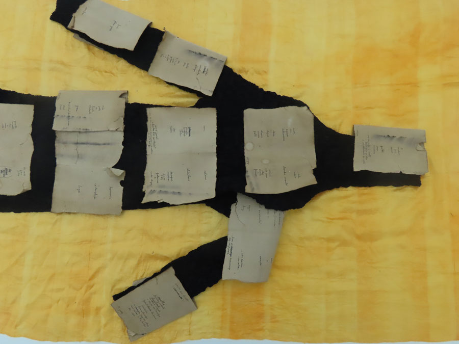 Neste piso, os trabalhos expostos ocupam igualmente teto, paredes e chão, e o som do batimento cardíaco da artista é constante. Agora, estremece não só o nosso o corpo, mas a própria arquitetura. «A dureza da madeira do cabide com cabo, que acompanha a coluna vertebral e o coração, simboliza a dura crueza da vida» [11] e está plasmada no desenho Para Gina Pane e Frida Khalo [imagem 2] que nos recebe quando regressamos ao piso 0. Na parede oposta, vemos duas naturezas-mortas que nos mostram dois corpos: Manga de Casaco [imagem 20], em tecido de lã, barro cru e cinza, sugere um braço amputado, e Mais Perto de Ti [imagem 21], em tripa de vaca e fio de algodão, um corpete justo cujo braço esquerdo se prolonga ad infinitum. Perto, os desenhos perfurados Mas onde Nós Estamos É a Luz e Desenho para Gina Pane [imagem 22], tal como para Lucio Fontana nas suas telas perfuradas, querem transcender o espaço, criar uma nova dimensão para a arte, relacionar com o cosmos que se expande infinitamente para além do plano confinado do quadro.