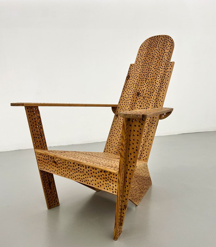Pés na Terra, perto de Lua, mostra fotográfica e performaticamente, em tríptico, os membros inferiores da artista, em pé, com os pés nus no chão frio de tijoleira de uma cela do Convento de Beja, as unhas pintadas de dourado e um vestido colocado no chão embrulha as peças principais da sua exposição sobre Soror Mariana Alcoforado que ali teve lugar; duas peças de fruta vermelhas, provavelmente maçãs; e um caderno, supostamente de notas. A fruta e o caderno remetem-nos, respetivamente, para o corpo físico e mental — e, intrinsecamente, para a domus. Este autorretrato realista e monástico da artista contrapõe os dois autorretratos (su)realistas — Coluna Vertebral e Aventuroso — em representação da vida (vertical) e da morte (horizontal), recolhidos muito perto de Cubo, donde emana o som do bater do coração da artista. Coluna Vertebral [imagem 6] retrata o ADN e o modus operandi de Maria José Oliveira, «simboliza […] a memória da sua atitude recolectora, uma tubolagem, onde acoplou objetos significantes numa assemblage vertical» [9] e o Aventuroso [imagem 7] o luto. Nesta peça, que a artista descreve como livro sem palavras exatas, o seu corpo surge representado por uma cabaia de seda preta, que nunca chegou a usar, pousada numa mortalha dourada. Por cima, repousam folhas tiradas do livro homónimo manuscrito em homenagem ao filho Miguel, exposto no piso -1 [imagens 8, 9]. «As suas folhas brancas foram marcadas pelo café, exibem manchas de pingos, e as palavras, escritas frente e verso, falam da ligação de mãe e filho para além da vida.» [10], lemos no manual de instruções. No piso -1, as escadas acentuam a ideia de casa e à chegada encontramos, imediatamente à esquerda, uma cadeira e duas peças de vestuário [imagem 10]. Pode Voar à Vontade [imagem 11], um tronco de acácia fixo à parede, sustenta um casaco da artista. Camisa em Poliestireno [imagem 12] parece levitar por uma suspensão vinda do teto. O casaco pendurado torna presente a artista, como se o tivesse despido há pouco, a camisa transparente, ligeiramente insuflada, materializa o seu espírito e Caruncho [imagem 13], uma cadeira de madeira rigorosamente perfurada, o tempo. A narrativa deste tríptico é sublinhada pelo livro da artista, Aventuroso [imagem 14], pela prateleira de cartão com papari e osso de choco Comida Primordial [imagem 15] e pela Construção Abrigo. Para Espaços Alquímicos (Nas Caves ou nas Altas Torres) [imagem 16]. Impressionante como, nestas diversas assemblages, se cruzam múltiplas histórias, e tomo agora conhecimento de que os fragmentos em ouro depositados nas duas colheres de alumínio foram realizados por uma aluna, numa aula no Ar.Co, na década de 1990, sobre Ana Hatherly, orientada por Maria José Oliveira, no âmbito da disciplina Estúdio, que criei para proporcionar aos alunos de joalharia projetos interdisciplinares. Como permuta, simbolicamente, os artistas recebiam uma peça de um dos alunos. Testemunhamos, assim, como tudo se perpetua e transforma nas mãos e no pensamento desta artista. Tudo é orgânico, pão, alimento. Alquimia. Transformações; Fronteira Líquida. Até Fui a Cacilhas e Resíduos Vegetais com Jarro de Vinho Tinto, são igualmente prova disso [imagens 17, 18, 19].
