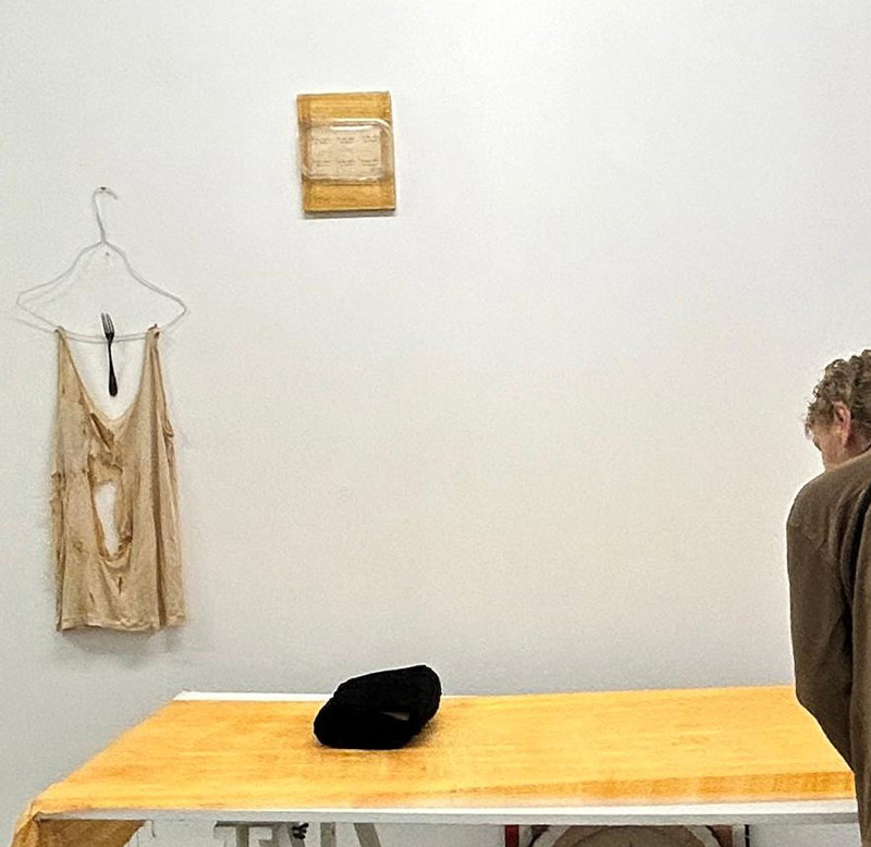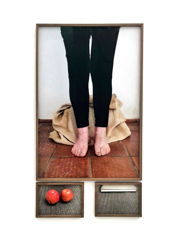 Este encontro improvável entre as duas artistas resultou num breve ensaio experimental e íntimo, no qual a peça de Maria Nurmela provou estabelecer múltiplas afinidades com a de Maria José Oliveira. A performance de Nurmela pareceu referir uma das fontes de Maria José Oliveira, Gina Pane, «como um dos expoentes máximos da body art, na década de setenta, que utilizava sempre o corpo como matéria e suporte para a sua criação artística.» [2] A voz de Maria Nurmela estabeleceu relação com o som do coração de Maria José Oliveira e o seu corpo com as múltiplas representações do corpo no trabalho da artista [imagens 3, 4]. Na sua obra, Nurmela «faz referência à famosa peça de William Shakespeare com o mesmo título, que aborda temas de identidade, papéis sociais e escolhas pessoais. Através de movimentos, objetos e símbolos, Nurmela destaca o tema da liberdade de escolha: a possibilidade de interpretar e experimentar a vida à sua maneira. Este solo profundamente pessoal e evocativo convida a refletir sobre a transformação e o legado.» [3] Este encontro não poderia, por isso, fazer mais sentido. O número significativo de obras e o espetro temporal que Tubolagem abarca lembram a exposição 40 Anos de Trabalho, de 2017, na Sociedade Nacional de Belas Artes. Encontramos algumas obras revisitadas, instaladas de outro modo, e novas. Ambas as exposições são afins pelo seu carater intemporal, pois não se distinguem épocas ou tempos. O modus operandi é circular, as obras e os materiais revisitam-se permanentemente, confundem-se sem hierarquia e sem competição. Todas são vitais para a artista e cumprem um propósito imperativo. São, por isso, singulares, insubstituíveis e impressionam pelo caráter autobiográfico, pela referência incontornável e permanente ao seu corpo e ao de alguns que já partiram. O primeiro filho, Miguel, é um deles. Em ambas as exposições, como refere João Pinharanda no catálogo da primeira, Maria José Oliveira ora coloca o corpo no presente ora no passado e é nele que «fixa as suas fantasias.» [4] Quem conhece a vida e o percurso artístico de Maria José Oliveira compreenderá melhor a sua obra, mas, de modo a orientar o visitante, a Galeria Graça Brandão elaborou um pequeno manual de instruções com breves sinopses, sublinhando que a obra deverá ser entendida como a artista a pensou. Refere também, nesse manual, as principais fontes artísticas e literárias abrindo-o com excertos do livro de artista Aventuroso — cujas palavras ressoam ao som do coração que ouvimos bater: «Quantos minutos tem a nossa vida?» [5] A leitura imperativa do texto de Adelaide Duarte apresenta a essência da artista, da sua obra e desta exposição. Dignos de realce são os títulos e o modo rigoroso e atento como as obras estão instaladas no espaço pela mão da artista e do arquiteto Alberto Caetano. Sem hierarquia e ordem cronológica, a artista apresenta trabalhos em múltiplos materiais e suportes, todos resultantes da sua gestualidade: seja desenho, pintura, colagem, palavra, construção ou apropriação. São múltiplas as «coisas» que desvia do seu lugar de origem e integra nas assemblages que cria: vestuário, alimentos, restos, partes, algumas possíveis de identificar outras menos «numa mimésis de naturezas degradadas.» [6] Todas fazem parte do seu quotidiano e carregam em si uma memória específica, num verdadeiro exercício de (in)disciplina [7] , como referiu Paulo Henriques no texto que escreveu para o catálogo da exposição 40 Anos de Trabalho.