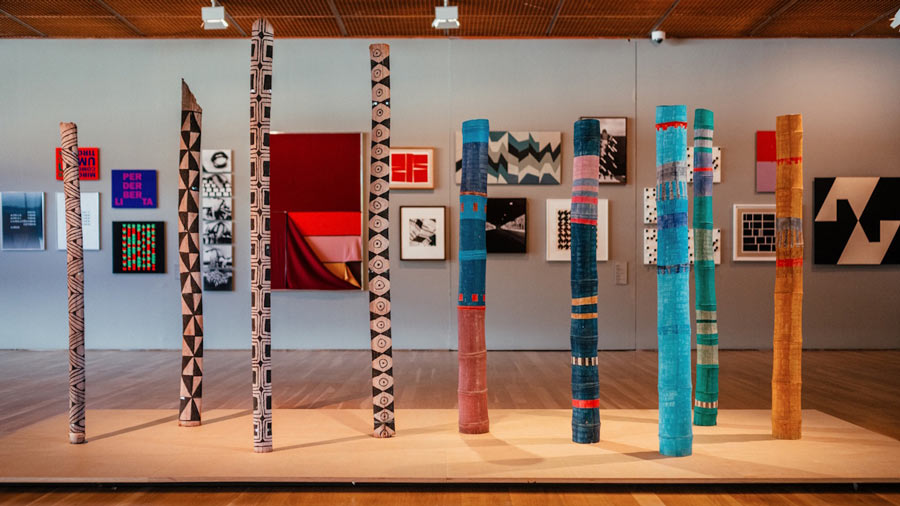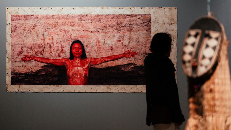 E nesse sentido, complexo brasil, exposição inaugurada na Gulbenkian em Novembro de 2025 com a curadoria de José Miguel Wisnik, Milena Britto, Guilherme Wisnik e projeto expositivo de Daniela Thomas, acerta na dissolução da unidade para revelar a vastidão e diversidade de um país que, valha a contagem oficial, é novo, e conta, com a sua história, uma história que é maior que ele mesmo. Ambiciosa e representativa daquilo que busca convocar, a exposição de 1600 m2 na Fundação Gulbenkian abarca (ou pretende abarcar) a quase totalidade da história e da cultura brasileira por meio de um panorama culturalista de diferentes regiões e fases. Na esteira dos diálogos transatlânticos cuja exposição de Paula Rego e Adriana Varejão é um exemplo, a Gulbenkian dedica dois pisos à tarefa que os curadores se propuseram: narrar o Brasil / os Brasis por meio de uma escolha de obras expressivas. O formato expositivo remete a uma estética antropológica de exposição dos povos: dividido por regiões e/ou culturas, a exposição resvala em um carácter pedagógico e histórico, também porque dotado de um viés culturalista. A imensidão do acervo é impressionante e deve-se também à sua diversidade: pintura, fotografia, instalação, vídeo, literatura, poesia – estão todas lá. De Cláudia Andujar a Clarice Lispector, de Pedro Américo a Denilson Baniwa, Bispo do Rosário a Oscar Niemayer, o Brasil é apresentado pelos melhores espíritos que já passaram por esta terra, revelando uma amplitude marcante de obras e temas. É atravessado, também por isso, pela implicação do passado no presente e dotado de um forte espírito decolonial, sublinhando nas ruínas da história colonial o aspecto bárbaro que existe na suposta civilização. É em uma arquitetura livre e ampla, que convoca o tempo e o caos organizado, que o complexo brasil revela ao mesmo tempo a riqueza e a exuberância da cultura brasileira e sublinha a inscrição e os efeitos do colonialismo nos povos africanos e indígenas, na estrutura sócio-económica do país e na sua psique nacional. Linha norteadora da exposição, a cultura brasileira é apresentada como inextricavelmente produzida/destruída pela violência colonial, pela inscrição material do racismo e pelo abatimento de culturas ricas e complexas por meio da demonização de práticas e povos. Fá-lo por meio de obras às vezes duras e às vezes fantásticas, dividindo sua energia entre a expressão de identidades solapadas pelo colonialismo e a reconfiguração do passado durante o processo histórico. Um exemplo emblemático são os quadros históricos que retratam práticas canibais e que acompanham a consequente apropriação modernista desse imaginário, na década de 20, no campo da cultura. A obra no início da exposição é emblemática do que pretende convocar. Uma árvore/madeira retorcida, obra de Henrique Oliveira, recebe os visitantes à entrada: chama-se O Retorno. O tempo tem caminhos misteriosos e aquilo que fazemos sempre está connosco onde quer que estejamos. A obra, que antecede a primeira parte da exposição, dedicada às culturas indígenas, funciona como uma mensagem a respeito das fleurs du mal plantadas pela cultura colonial no país – e as árvores, plantas, obras, músicas, esculturas, arquiteturas, violências e fracturas que daí surgiram. As obras aparecem, nesse sentido, ora como representações narrativas de uma história, ora como expressões do atravessamento sensível da história e da violência nos corpos artísticos, revelando a constante desconfiguração e reconfiguração linguística, psicológica e física necessária para lidar com a violência que marca a história do país. É o caso por exemplo do Manto de Arthur Bispo do Rosário, peça belissimamente exposta no primeiro piso da exposição. Bordado com palavras, símbolos e números, feito de uma bricolage de tecidos desfiados, o Manto é uma tentativa de reconciliar o eu ao uno, registrando memórias e emblemas em um manto que é continuidade e testemunha de um eu psicótico ou mágico, atravessado por tensões históricas. Foi confeccionado para ser usado, segundo ele, diante de Deus no dia da sua passagem. Tendo vivido anos de sua vida em instituições psiquiátricas, o trabalho de Bispo do Rosário revela não só o atravessamento da religião no seu trabalho, como questiona as fronteiras entre desorganização psíquica, misticismo e violência institucional em um objeto que funciona ao mesmo tempo como proteção e como emblema. De facto, no Brasil, o extraordinário e o cotidiano, a fé e a mendicância, a violência e a cegueira, o canibalismo e a antropofagia configuram uma encruzilhada constante, em que há sempre uma história de histórias, uma estrada de estradas e um tempo cheio de contradições onde pulsa o coração do país. Próximo de fotografias de Claudia Andujar, das histórias do cangaço brasileiro, de cabeças decepadas, do anúncio documental de escravos fugidos e dos esforços ‘progressistas’ de destruição da Amazónia, a exposição é uma panóplia de arte e história, sublinhando a violência estruturante da experiência nacional, bem como a exuberante pluralidade de formas estéticas que se inscrevem na cultura brasileira. Como sintoma, como vingança ou como simples ímpeto criador, as obras apresentadas aparecem sobretudo como uma expressão da história nacional, registro do movimento de dominação, contradição, transformação e metamorfose que atravessou as suas geografias e povos. No meio disto tudo encontram-se também as vanguardas estéticas que se dedicaram a pensar, pintar e construir esteticamente o país – seja o modernismo arquitetónico brasileiro, sejam as vanguardas concretistas e neo concretistas, expostas como poesia e como design – e que revelam as mudanças materiais advindas da segunda metade do século XX bem como o projeto político de dar contorno à identidade nacional por m