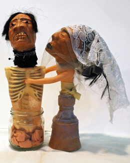 The artists in this section deal with the condition that makes fools and poets of us all – the sheer ability of love to blind us, wherein our sense and sensibility falls aside, allowing a sensuousness to rise, as we literally fall in love. The sheer brutality of love’s power and the potential for its abuse in our mutable emotions, are exposed in these works. The blindness, its sheer intensity that forces us to seek solace from our senses and seek heartily for answers elsewhere, is a force that beckons all lovers and all relationships. Samira Abbassy is an artist, based in New York from where she has been working producing stringent works about the effects of the war in the middle-east on our globe, which now revolves around the sun, affected and saturated with fear and gloom. In the recent months, she has been creating what she calls ‘sculpture objects’ a mixture of the study of the figurative but objectified to suggest a emotion. These static miniature forms are full of life, in hysterical motion, their imploding cries depicting a stubbornness that has been afflicted with pain, remorse and gendered often – all incapacitated but not by drugs or alcohol but by the sheer pain of love. The struggles are found within the ways that these animated bodies struggle to suggest trying to overcome their situation, an overcoming that means hurt or a coming to terms with separation and moving on. Cecília Costa is based in Lisbon, from where and for a long period of time her hibernating work has emerged. It is as much a work as a statement; a very personal making that explores the myth of Penelope, a myth that like other artists in the exhibition, is ready to contest and find a new context for its lingering place in our imaginary and its potency in our resolving of gendered roles. Costa, uses the most sensuous bodily element, her hair, to describe and create a undergarment that covers her dignity, the pubic zone. In recasting the natural into the seemingly unnatural, she allows a re-use and reformation of information and place. Her work suggests sensualities as well as a desire to speak about the unspoken, the hidden, the mark of her gender. The work, a weaving and a waiting, is about the role of women in society, where the societal teaching remains more or less unequal, unwarranted hierarchical and unjust. Costa informs us all that such mythologies and such illustrations of knowledge remain part of our realities as we mediate between genders and time. K P Reji is a painter based in Vadodara, India and is presented in the exhibition by three canvases. Each canvas shows a couple surrounded by a strange environment of broken houses and a set of possible entrances and exits. It is in this secretive, primal environment that the couple try&