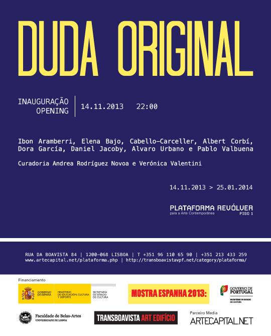 A Plataforma Revólver tem o prazer de apresentar no contexto da Mostra Espanha 2013, “Duda Original”, uma exposição colectiva com a curadoria de Andrea Rodríguez Novoa e Verónica Valentini. A exposição apresenta oito artistas maioritariamente espanhóis, todos nascidos a partir de metade dos anos sessenta, que se irão encontrar na Plataforma Revólver, em Lisboa, para apresentarem um novo trabalho site specific.