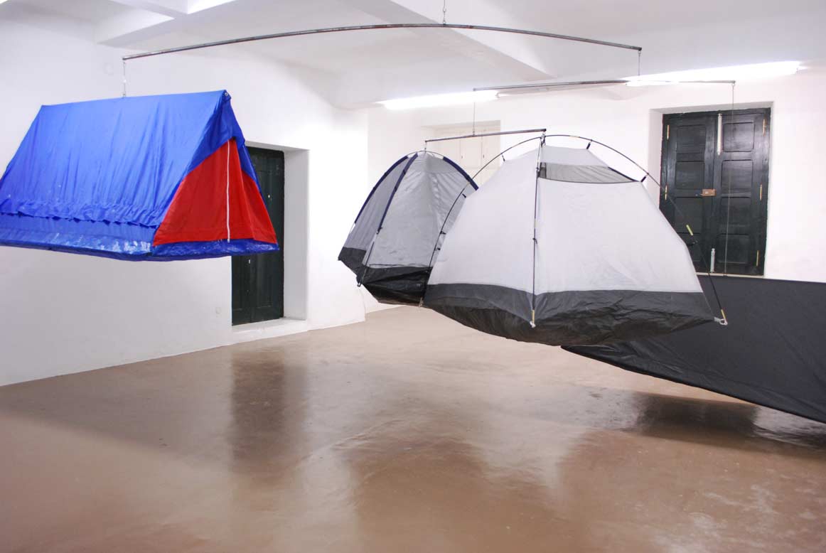 La instalación que aquí presenta, Acampada libre, es un reto de equilibrio y constituye un organismo vivo, dinámico, en varios sentidos. Consiste en una escultura móvil —que nos recuerda lejanamente a las hechas por Calder— formada por tiendas de campaña que sirven al mismo tiempo de vivero flotante para caracoles; se exhiben así con una continua capa de baba de caracol, como la que se usa para mantener la piel joven.