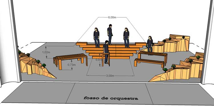 A cenografia do espectáculo foi concebida pelo artista André Banha, que vem desenvolvendo projectos na área da escultura e do desenho. O seu trabalho já era caracterizado por um lado cenográfico forte onde a dimensão artesanal está presente. Os espaços que cria com as suas obras eram já eles espaços para habitar, para percorrer - escultura e desenho têm uma implantação espacial.