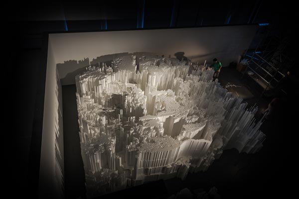 Ao fundo desse corredor desaguamos numa sala onde nos espera uma espécie de maquete urbana em esferovite. Uma cidade branca vertical, que nos convida a subir ao andaime situado ao lado e vê-la de cima. De lá, de cima do andaime vertiginoso, vemos dois rostos no meio do que emaranhado de arranha céus artificiais. A cidade é um organismo.