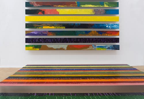 PC: Em Espanha, e noutros sítios também, começou-se a falar de pintura expandida. Rosalind Krauss é frequentemente citada para fundamentar teoricamente a expansão do plano visual para a tridimensionalidade. No meu trabalho a deslocação da superfície da pintura aconteceu de uma maneira progressiva. Há um momento fulcral que tem a ver com o desenvolvimento do meu trabalho durante os anos noventa. Refiro duas exposições: uma na Fundação Miró em Mallorca (“Campo de Sombras”, 1997) e outra, um pouco antes, no Museu do Chiado (“memória involuntária”, 1996). Nesta os meus desenhos partiram de outros desenhos, de outras coisas. Na altura a Raquel Henriques da Silva perguntou-me se eu queria trabalhar com obras da coleção e eu fui ver tudo o que havia nas reservas e fiquei seduzido por um conjunto de trabalhos a pastel seco de Sousa Pinto, uns feitos em Paris, outros nos seus arredores e na Bretanha, e ainda outros numa quinta que Sousa Pinto tinha nos arredores de Lisboa, em Benfica. Escolhi onze obras, mas sem saber ainda bem o que iria fazer. Passei cerca de um mês a ir ao museu às horas que me apetecia, incluindo à noite. Copiei os desenhos à vista, seguindo técnicas já por mim usadas anteriormente, como utilizar o desenho de linha ou desenhar com a mão esquerda alternando com a mão direita. A certa altura há uma coisa que me faz parar e que surge aos meus olhos na textura do pastel seco: as misturas desta cores em pó, revelavam-se aos meus olhos como fundos a partir dos quais o desenho despontava. E decidi fazer pinturas com aquele tipo de fundos de cores. Até esse momento todo o trabalho entre 1990 e 1995 é um trabalho quase monocromático, porque uso uma cor que ora é preto ora é um vermelhão ou laranja, riscando, sulcando a sua superfície com uma espátula ou estilete. Aí, onde o fundo tem uma presença muito grande, trabalhado em termos de textura, mas mesmo assim monocromático, o desenho como que emerge desse fundo, afirmando-se por causa dele. A partir de 1996 esses fundos começaram a ter outras características pois revelam misturas de cores. Nos painéis da exposição do Museu do Chiado, quatro conjuntos de onze painéis cada, foram sulcados sobre esses novos fundos os contornos retirados dos desenhos de Sousa Pinto. E de seguida apareceu a questão do fragmento. Tinha acabado de fazer uma pintura que proporcionava uma leitura em conjunto, em que o olhar circulava de uma coisa a outra, de uma cor a outra, de uma linha a outra, de um painel a outro. Gosto de comparar com o que acontece quando estamos a ver pintura, como fazemos quando estamos a ver por exemplo uma pintura de uma certa dimensão, seja um Ticiano, Tintoretto ou Veronese. A determinado momento encontramo-nos obcecados por pormenores desses quadros, vendo-os fragmento a fragmento mas depois fazemos a sua união quando distanciamos o nosso olhar. Criamos uma história a partir dessas parcelas visuais. Na Fundação Miró parto de um conjunto de recortes que Miró recolheu em revistas e também de pequenos objetos que ele encontrou e que utilizou para desenvolver os seus desenhos. Uso assim o mesmo universo de partida de Miró para fazer os meus. Alguns dos fundos que receberiam esses desenhos ganharam entretanto autonomia e passaram a existir por eles próprios, exibindo fortemente a sua cor. A linha foi esquecida e alguns painéis começaram a ser abstractas misturas de cores. O ano de 1996/97 representa um momento de transição para um novo tipo de trabalhos que emerge de dois distintos projetos e do trabalho profundo de observação por mim seguido. Passei de sobreposições de desenhos, de diferentes tipologias de representação, para a situação em que posso ter desenho ou não o ter, fazer um fundo abstracto ou não. Começam a surgir vários fundos abstractos, pintados de maneiras diferentes, com contrastes de cores diferentes e funcionando ou confrontando-se uns com os outros. Nos anos seguintes os fragmentos serão organizados em grelhas (a série das “janelas”, 1998). O suporte eram grossas placas de MDF, o alumínio só começa em 2001/2002. É engraçado como uma falha técnica, a fragilidade do MDF ou o empenamento das placas com a humidade, origina a procura dum novo material que de seguida altera todo um modo de pintar. Por outro lado ao ter usado placas de espessuras diferentes e ao colocá-las lado a lado fez-me descobrir uma ponto de interrupção, uma “décalage”, uma descontinuidade no fluir da pintura. E nesse momento comecei a trabalhar sobre a profundidade, a distância à parede. Quando quis aumentar a profundidade fiz caixas mais profundas, e a certa altura queria mais e os carpinteiros já não o conseguiam fazer, ou as caixas ficavam muito pesadas. Comecei a utilizar as caixas de alumínio. Estas, porém, também tinham limitações de espessura, por causa dos perfis e do material que se usava. Só com a exposição do Centro Galego de Arte Contemporânea (“piso zero”, 2005), é que descobri, seis meses antes da sua inauguração, que podia fazer painéis com significativa profundidade se os deixasse abertos, em forma de “U”. No espaço da sala emblemática desse museu de Siza Vieira, a sala de duplo pé-direito, apresentei quatro obras, conjuntos de diversos destes novos painéis, ocupando as paredes de quatro maneiras. Depois de 2004 e até agora, tenho dialogado exaustivamente com a questão do físico distanciamento da superfície da pintura em relação à parede em que se encontra colocada, jogando com painéis estruturados arquitetonicamente e com incursões pelo meio noutros tipos de suportes como os ondulados ou recortados. De certo modo, nunca deixei de fazer estes painéis, mas agora voltaram com outra intensidade.