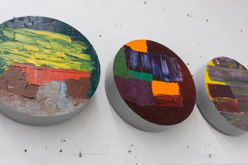 PC: A base é sempre o alumínio, só que alguns são feitos em alumínio cru, cuja superfície é por nós (eu e o meu assistente) preparada para receber a tinta acrílica. As partes laterais são envernizadas mate (antes acontecia que quando eram tocadas ficavam marcadas devido ao suor ou gordura, o verniz evita isso). Entretanto tenho estado a experimentar estes outros painéis que são lacados. Ao serem lacados põe-se uma outra questão: como é que uma superfície lacada recebe a tinta? A tinta de óleo adere perfeitamente. Voltei assim a pintar a óleo. Nestes painéis circulares a pintura resulta diferente porque o material é diferente. Deu-me muito prazer voltar à tinta de óleo. Tinha começado a pintar a óleo nos finais dos anos 1990, tendo mudado para as tintas aquosas quando descobri que conseguia ter um bom e resistente primário para o alumínio. Com a tinta acrílica tudo seca muito mais rapidamente, principalmente as espessas camadas de tinta que gosto de pôr. Sempre que altero o tipo de tinta o resultado visual também é diferente. Aparecem coisas diferentes.