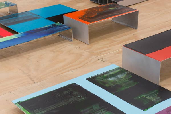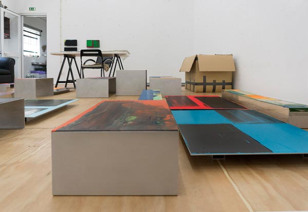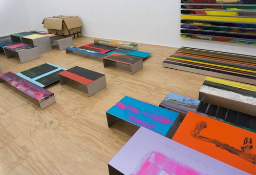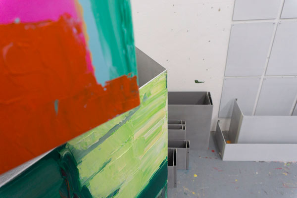 PC: Sempre gostei de obras em fragmentos, de conjuntos de painéis. Os painéis em alumínio dobrado, com diferentes dimensões e profundidades têm estado presentes no meu trabalho desde o início dos anos 2000. Em 2009 comecei a fazer outro tipo de peças, que embora organizadas em grupos têm pouco volume e são recortadas de um modo irregular. Resultam da vontade de ir experimentando diferentes tipos de suportes. Nem sempre resultam bem. Apeteceu-me depois voltar a estruturas mais regulares e portanto voltei aos conjuntos de painéis rectangulares. De certo modo estou a retomar coisas que já fiz, embora a maneira de pintar seja mais brutal e se olhar com atenção é possível notar como vai variando o modo de colocar a tinta. Quando sinto que estou a ficar demasiado preso a um tipo de suporte resolvo mudar, voltando eventualmente a formas e suportes que utilizara anteriormente. Nunca sei bem quando termino uma série. Posso voltar para trás também, já me aconteceu várias vezes. De facto, acabo por andar muito à volta do suporte, atraiem-me as caixas, os volumes, o aspecto arquitectónico. A arquitetura e o processo construtivo tanto surgem nas obras como na apresentação da exposição, na criação do espaço em si, na obtenção dum circuito para o olhar. O carácter de instalação está presente em diferentes séries de trabalhos. Agora vou gastar algum tempo a imaginar como é que estas diferentes obras irão resultar na galeria em Braga [galeria Mário Sequeira], como criar as dinâmicas visuais necessárias. Acho que isso é tão importante como fazer as obras em si. A colocação de uma obra numa parede determina sempre a forma como as coisas são vistas.