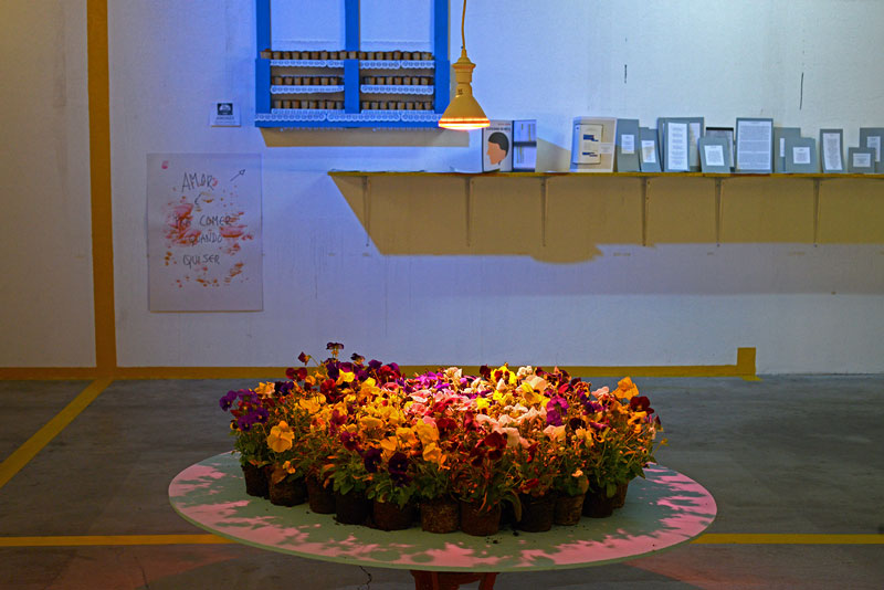 Em “O que falta é amor” procuramos elementos estéticos que estimulassem os sentidos e que fossem sugestivos do amor. Fomos literais nesse sentido. Não bastasse o título e a convocatória pública para partilhar histórias de amor — mas também sobre o desamor, sobre o perder, sobre incapacidades... — enchemos o espaço de amores-perfeitos (que os alquimistas associavam ao perfume do amor) e uma prateleira com Amores para as pessoas comerem. Para inalarem o amor e degustarem o amor, enquanto contam e escutam histórias sobre amor. Nesse sentido a sala funcionava como uma sensação aumentada, uma espacialização sensorial.