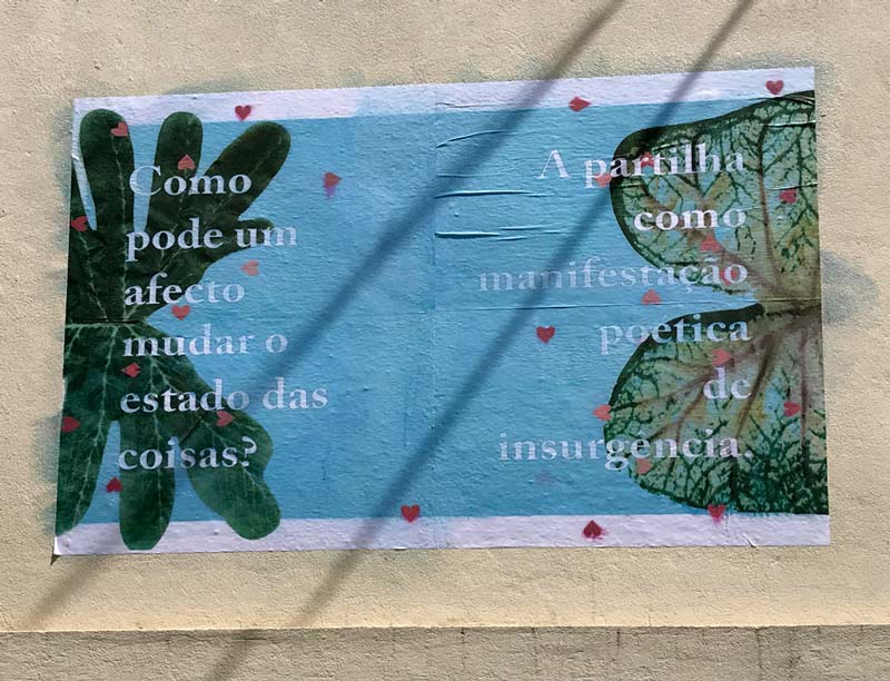 AA: Sim; estética e ética. Por coincidência, na altura lia o Lawrence Ferlinghetti e o título do seu livro “A poesia como Arte Insurgente” foi adoptado como mote. E isso conectou a ideia da partilha das emoções como um método cuja mera partilha constitui um acto insurgente. Isso deixou-me um bocado nervoso. Embora possa dizer que tenho uma prática bastante desmaterializada, ou efémera, a partilha-enquanto-acontecimento, e em particular, abrir mão da direção do evento e convidar para partilhar amor —seja lá o que isso for— foi-me bastante intimidador.