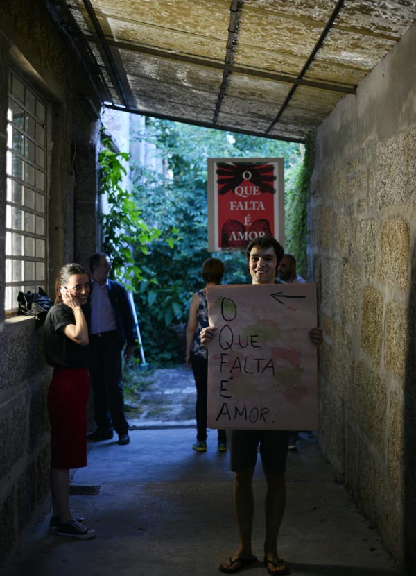 AA: Diria que sim, mas também de uma reflexão que me ocupa sobre a vida interior enquanto o grande projeto artístico. Isso não se descola da minha carreira de investigação académica, que tem sobretudo incidido sobre o papel do afecto, sobre o sentimento, sobre registos no corpo que não são linguagem e as limitações que isso opera sobre o conhecimento. Isto tem-me trazido muitas questões sobre qual o território da minha acção; se estou no território da arte ou noutro tipo de actuação. Por isso, na minha prática artística faço sempre um exercício de definir: onde/quando é que este evento se torna artístico? Onde é que “O que falta é amor”, mais do que uma intervenção no âmbito do cívico se torna artístico? “O que falta é amor” é uma alegoria sobre a importância do sentir, cheia de símbolos, um evento de forte dimensão estética atuando sobre o sensível, ao mesmo tempo que procurava uma sensibilização da consciência. É como se a arte em vez de gritar o político, apenas se deixasse tocar pelo político, gentilmente. E essa para mim é uma qualidade da ordem estética, uma insistência na delicadeza, a recuperação do valor das nuances e a reactivação permanente do sensível. Quero acreditar que estas qualidades nos predispõem para a surpresa e admiração, cujo oposto é a indiferença. E a indiferença é um estado muito conveniente ao exercício de poder, muito perigoso, não só sensorialmente, mas também politicamente.