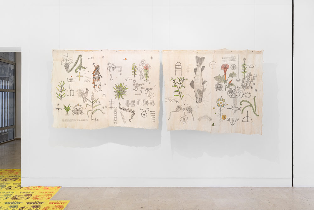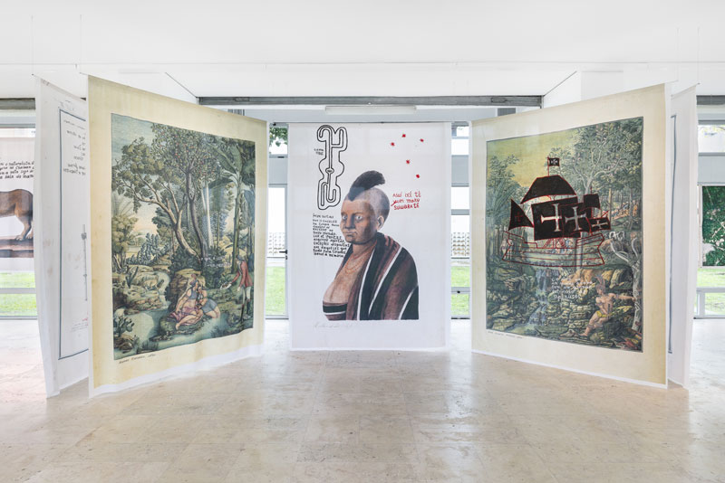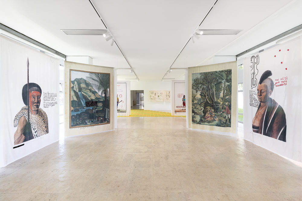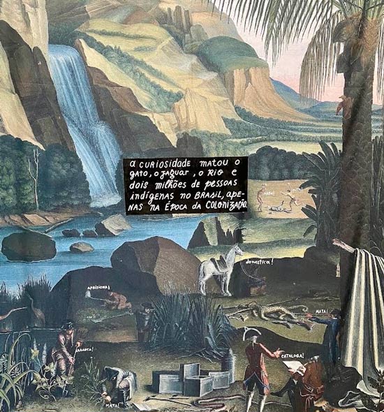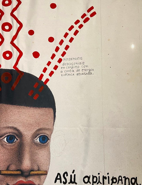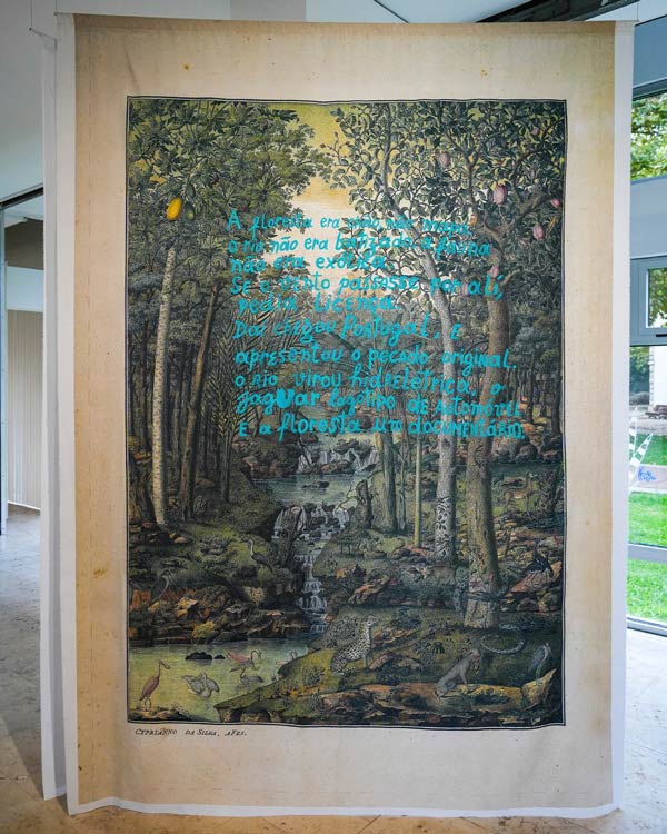 Nascido em Barcelos, no Amazonas, Denilson Baniwa desenvolve uma prática que atravessa múltiplas linguagens, como pintura, desenho, performance, intervenção digital e apropriações críticas de acervos iconográficos. Cada gesto que compõe sua produção configura-se como uma insurgência poética, capaz de tensionar as estruturas que ainda organizam a memória ‘oficial’, abrindo brechas por onde outras histórias, cosmovisões e narrativas podem emergir. Fica evidente, ao percorrer a galeria, o potencial da arte como espaço de cura e de confronto, articulando de forma indissociável dimensões éticas, espirituais e políticas. O conceito de contra-feitiço se conecta ao feitiço colonial, que transforma elementos das culturas indígenas em fetiches ou mercadorias, funcionando como instrumento de controle simbólico e cultural. Diante das obras, observa-se como o gesto de Baniwa subverte a lógica colonial, questionando quem detém o poder sobre a memória e a narrativa, ressignificando imagens para restaurar protagonismo. Ao reorganizar acervos coloniais, Baniwa pratica esse contra-feitiço, revertendo o feitiço colonial que transformou territórios, seres humanos e não-humanos em objetos de consumo e espetáculo, reafirmando a identidade indígena. Essa desprogramação atravessa o espectador, provocando uma experiência de tensão, reflexão e consciência sobre a resistência indígena, evidenciando um gesto insurgente que desfaz a dominação colonial e afirma a criação contínua das culturas indígenas. Logo na entrada, o chão deixa de ser suporte neutro, cartazes coloridos e vibrantes se oferecem aos pés do visitante, convocando o corpo a atravessar a obra e a se confrontar com ela desde os primeiros passos. Neles, lê-se a frase “Lisboa é terra indígena”, que afirma que o pensamento e a continuidade indígena não se limitam à geografia da floresta, funcionando como performance permanente. Ao percorrer a exposição, torna-se notória a forma como a presença ancestral e o território se articulam no espaço, ao mesmo tempo que esses cartazes evocam a memória de objetos sagrados aprisionados em museus e arquivos históricos e etnográficos de Lisboa e Coimbra, como, por exemplo, o manto ritualístico. A atuação deste trabalho provoca a reflexão sobre a persistência do colonialismo nas instituições ocidentais, suscitando a consciência da continuidade e existência indígena. No percurso da exposição, a série Rasuras (2025) merece atenção especial. Nela, Baniwa intervém sobre impressões digitais em tecido do acervo do naturalista Alexandre Rodrigues Ferreira, disponibilizadas pelo Museu Nacional de História Natural e da Ciência da Universidade de Lisboa. As obras tornam visível a dívida histórica do etnocídio contra os povos indígenas e revelam como os acervos iconográficos reforçaram a mercantilização de objetos sagrados, das vidas indígenas e da fauna e flora local. Nesse gesto, a obra estabelece um diálogo com o pensamento do ativista e escritor Ailton Krenak, autor de Ideias para Adiar o Fim do Mundo (2019), que alerta para a necessidade de desestabilizar as lógicas de dominação antropocêntrica que estruturam nossa relação com o mundo. Como ressalta Krenak, “talvez estejamos muito condicionados a uma ideia de ser humano e a um tipo de existência; se desestabilizarmos esse padrão, nossa mente poderá sofrer uma ruptura, como se caíssemos em um abismo. Mas quem disse que não podemos cair? Quem disse que já não caímos?” (Krenak, 2019). A obra de Baniwa ecoa com o pensamento de Krenak, evidenciando a necessidade de repensar as estruturas que condicionam nossa relação com o meio em que vivemos e com as formas de existência. O artista amplia sua crítica ao intervir em imagens do acervo colonial, inserindo nos corpos representados elementos da cultura visual contemporânea, como marcas globais, objetos tecnológicos e signos da vida urbana para deslocar a percepção do espectador e provocar um choque visual, rompendo estereótipos que associam os povos indígenas a um passado fixo, alheio à modernidade. Ao evidenciar que o uso de roupas de marca ou de aparelhos tecnológicos não implica a perda da identidade indígena, Denilson afirma a contemporaneidade desses povos, reposicionando a tecnologia como instrumento de comunicação, resistência e afirmação política. É possível notar também que Baniwa articula imagem e palavra em obras de grande escala, incorporando inscrições textuais que funcionam como camadas de leitura crítica. Pintadas à mão, de forma sutil, sobre o tecido impresso, essas frases exigem aproximação física, instaurando um gesto de atenção e escuta que se contrapõe ao distanciamento do olhar museológico dominante. Entre estas frases, destaca-se “Pensamentos decoloniais em conflito com a conta de energia elétrica atrasada”, que emerge da cabeça de um homem indígena, expondo o choque entre a produção de pensamento crítico e as urgências concretas da vida cotidiana, revelando sujeitos indígenas atravessados por responsabilidades econômicas e desigualdades estruturais. Outras frases, como “todo acervo fechado é uma coleção de mortos, sem ânimo, sem paixão”, denunciam o carácter fetichista das coleções coloniais, em que corpos, objetos e até espíritos de animais permanecem aprisionados. Já a pergunta “Mas afinal, o que é arte?” desloca o debate para o campo artístico, convidando o público a refletir sobre os critérios institucionais que definem o que é considerado arte e quem detém o poder de legitimá-la. Ao condicionar a compreensão da crítica a um gesto ativo de aproximação e atenção, Baniwa transforma sua prática em ato político, revelando que palavra e imagem juntas têm o poder de questionar as narrativas e os sistemas de poder que determinam o que pode ser visto, preservado e reconhecido como arte. No contexto português, marcad