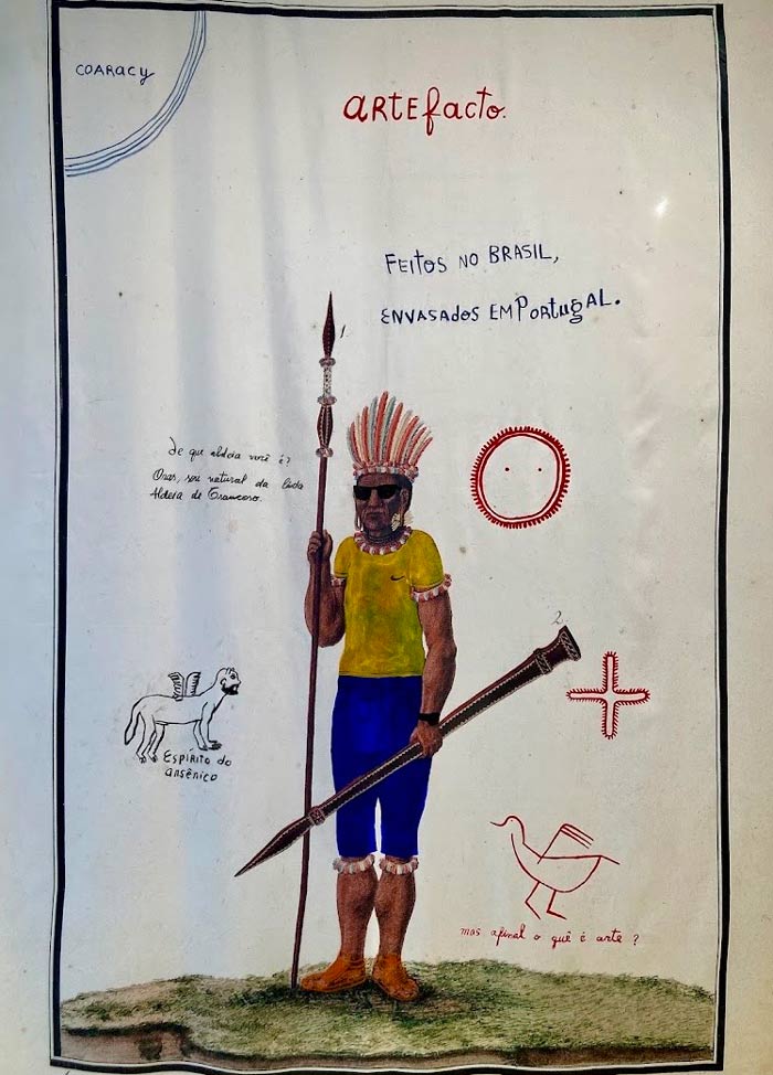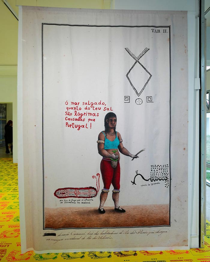 DB: Quando escrevo “Lisboa terra indígena”, estou afirmando que o pensamento indígena não está limitado à geografia da floresta. Ele pode habitar qualquer lugar. A presença indígena é espiritual, política e cosmológica. Dizer que Lisboa é terra indígena é também lembrar que muitos dos nossos objetos sagrados, sequestrados durante o colonialismo, estão aqui — e que eles continuam vivos, pulsando dentro dos museus. Essa obra é uma forma de convocar esses espíritos de volta à conversa, de reativar suas forças. Ela também desafia as imagens coloniais ainda projetadas sobre nós, mostrando que ser indígena é ocupar o mundo inteiro com outras formas de existência.