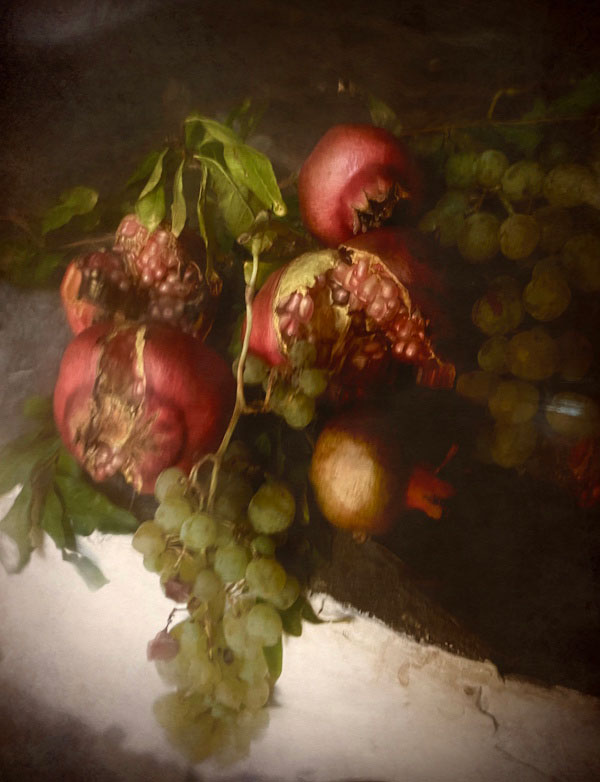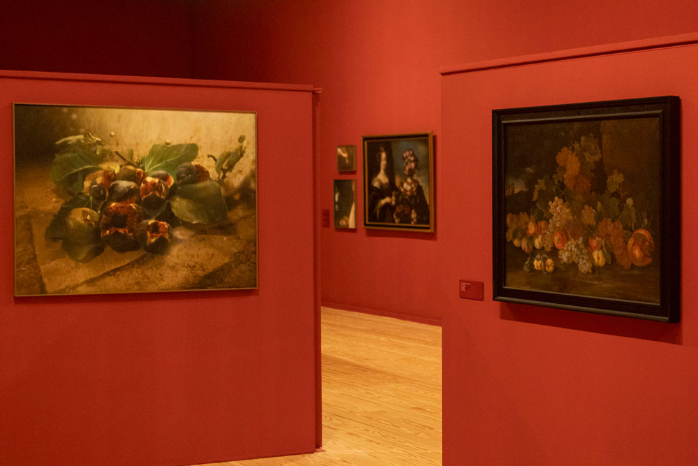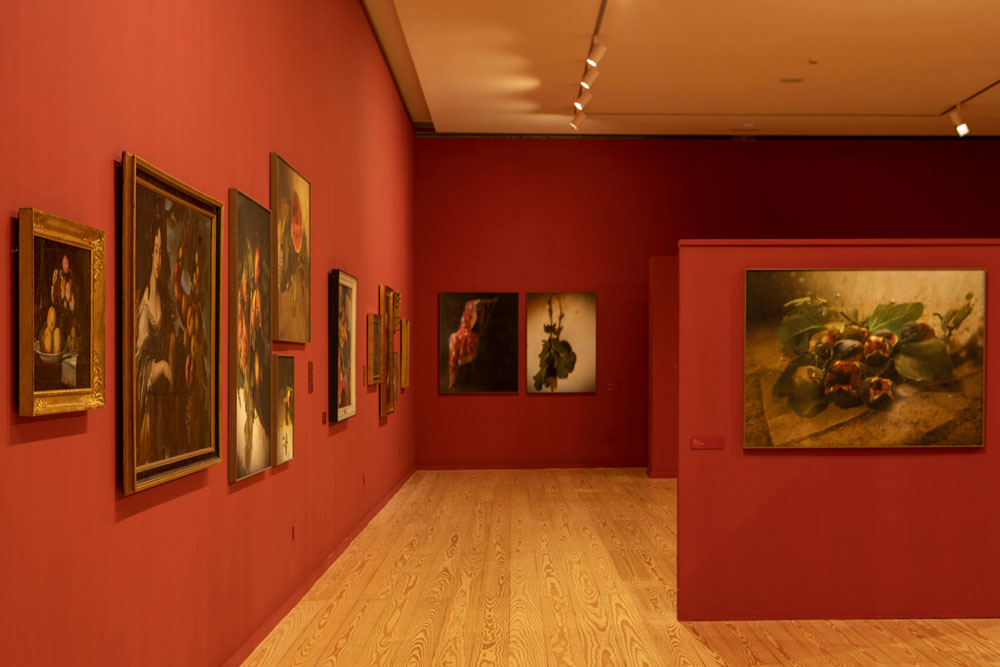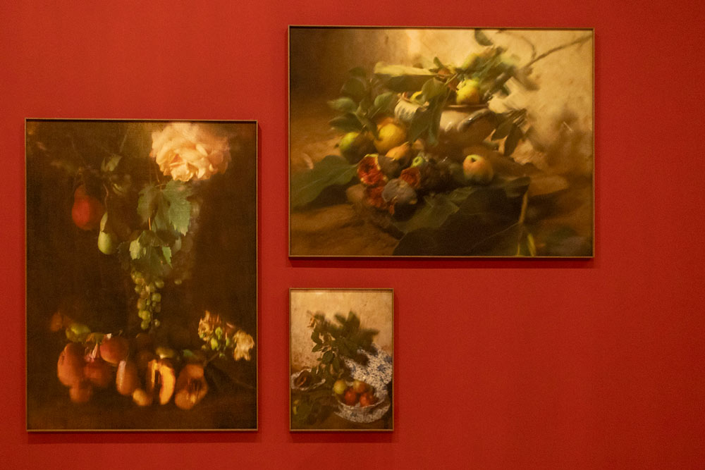 Como em tantas outras exposições de naturezas mortas (Les Choses au Louvre em 2022 foi uma notável excepção, pois procurava revelar a alma secreta dos objetos inanimados), contentamo-nos em meditar um pouco sobre a futilidade das coisas, de divertir-nos um pouco (diante da horrenda lagosta de Eduardo Viana) e, basicamente, de simplesmente admirar sem mais a técnica repetida mil vezes, como o virtuosismo do jogo de luz sobre as uvas na pintura anónima do século XVII/XVIII, Fruteiro (numa paisagem), ou a suavidade táctil das pétalas das violetas silvestres ("amores perfeitos" em português) de Alice Grillo de Lima (primeiro quartel do século XX). Contentar-nos-íamos com isso à falta de algo melhor não fosse o facto de, misturadas com estas 28 telas nas paredes vermelhas, estarem 28 fotografias de Rita Magalhães. Fotografias, realmente? À entrada da sala, com vista para a exposição, uma extravagante moldura dourada apresenta uma Vanitas discreta. O objetivo é evidente, levar o visitante a interrogar-se: pintura ou fotografia? Então, claro, o pequeno jogo poderia ser de distinguir sem ler as legendas o que é pintura e o que é fotografia, e, às vezes, podemos enganar-nos. Uma das distinções evidentes aqui, é antes de mais que as naturezas mortas pintadas são, na sua maioria, nítidas, completas, estáticas, bem acabadas, bem “polidas”, elas afirmam-se claramente face ao mundo, elas assumem o seu papel de representação. Enquanto as fotografias são desfocadas, indecisas, caprichosas, movimentadas, as formas são abertas, fragmentadas, os contornos são imprecisos.