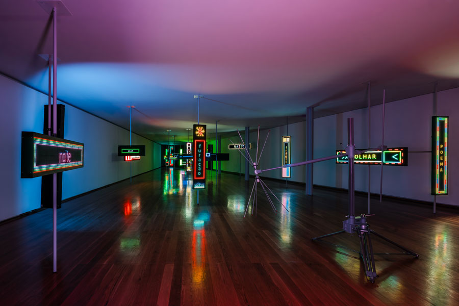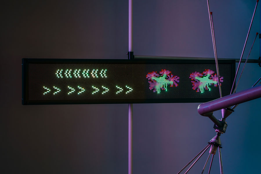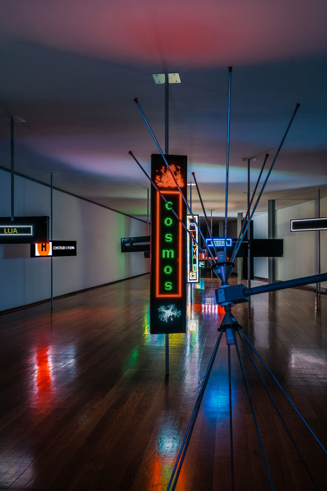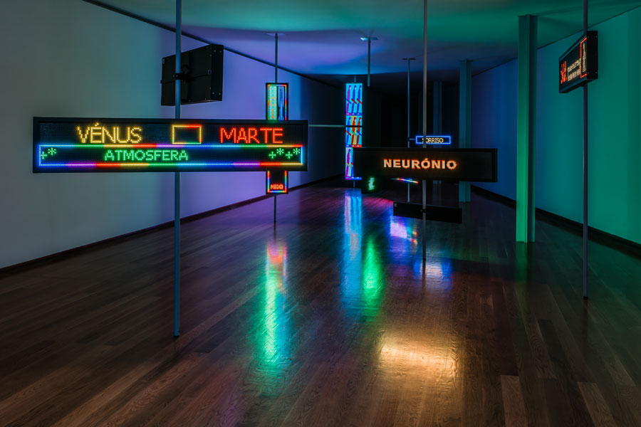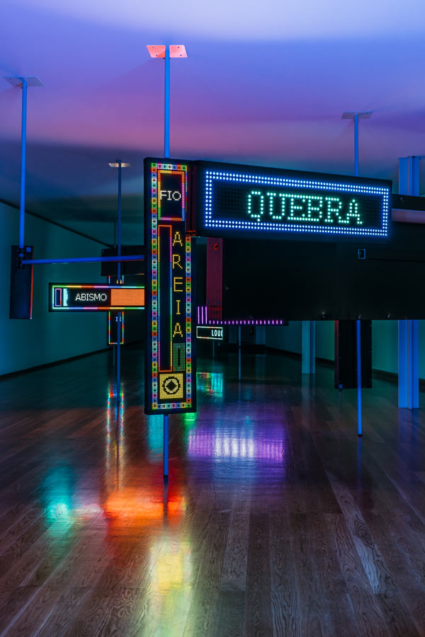Desde a sua entrada, o espaço expositivo organiza-se como um campo de forças onde diferentes regimes de visibilidade se sobrepõem. Estruturas luminosas, inscrições gráficas e dispositivos eletrónicos articulam-se numa composição que recusa a linearidade e a estabilidade. Não existe uma narrativa unívoca, mas antes uma constelação de sinais que exigem uma leitura fragmentada e descontínua. A minha experiência não será, naturalmente, igual à do visitante seguinte ou anterior a mim, que se tiver passado mais desatento ou com menos tempo, poderá não ter compreendido a variedade de palavras que cada sinal luminoso transporta. Esta recusa do discurso fechado não é apenas formal, corresponde a uma posição crítica perante a saturação informacional que caracteriza o presente.