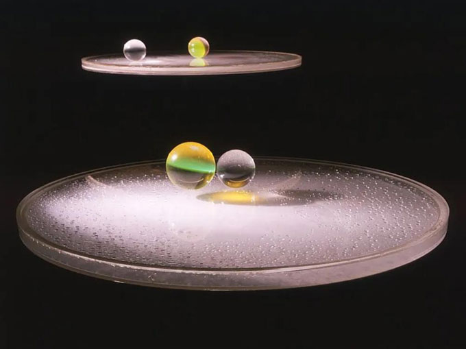 Quando a água é vertida no disco, condensa-se em padrões que se assemelham a nuvens interestelares de gás, mas logo se contrai em gotículas esféricas precisas, vivas e trémulas, que por sua vez se tornam cada vez mais homogéneas, cobrindo toda a superfície do disco. A água no disco influencia o equilíbrio geral e é influenciada por este, exercendo um efeito sobre o movimento das esferas.