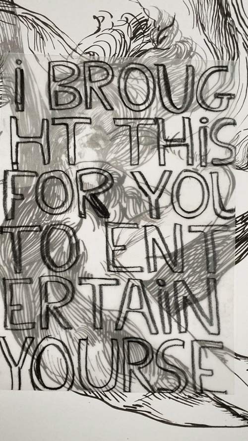 LW: Este poderoso desenho consiste num texto falado. As personagens que falam não são visíveis. São sugeridas pela sua combativa troca verbal. A sua fúria emocional torna-se visível pela sua forma de apertar e interromper o texto, e de o representar com gestos de fúria. Identifica a personagem/perspetiva não-humana que referes e explica por que razão te referes a esta obra, composta exclusivamente por texto, como “figurativa”.