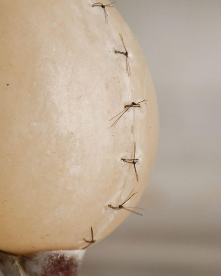 FB: As obras Labuta (2024) constituída por pétalas de cravos cosidos à mão, Parti (2025) constituída por osso, cera e cabelo humano e A Esperança de um Flutuo (2025) que incorpora uma rede de algodão e dentes de leão, são obras que exigem uma grande noção corporal.