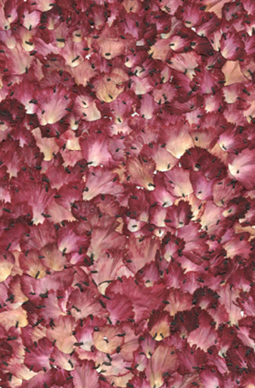 Esta obra estava presente no resto da exposição. A base da obra era a concha, que era uma casa, uma arquitetura animal que é um abrigo como as outras obras que tinham outras formas. Colecionei as pétalas, desidratava e com o almofariz transformava em pó. Para fazer a quantidade de pós que fiz, precisei de muitas flores. De novo, é quase um trabalho invisível. A mim interessa-me também o esforço que não se vê.