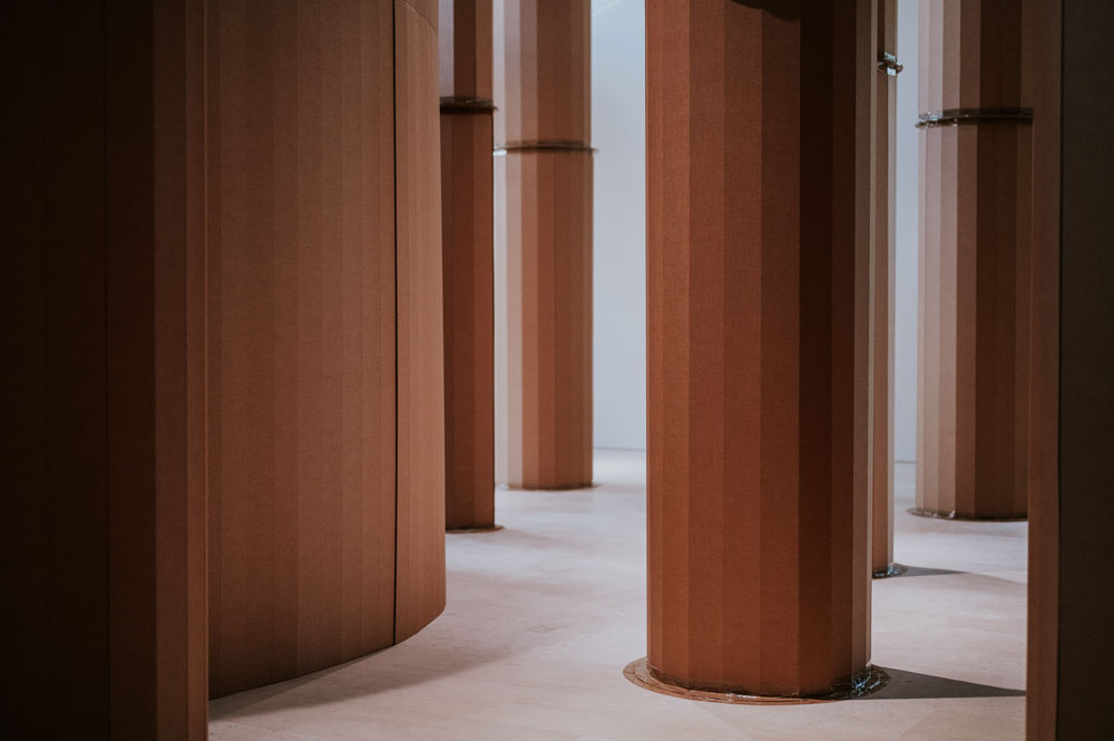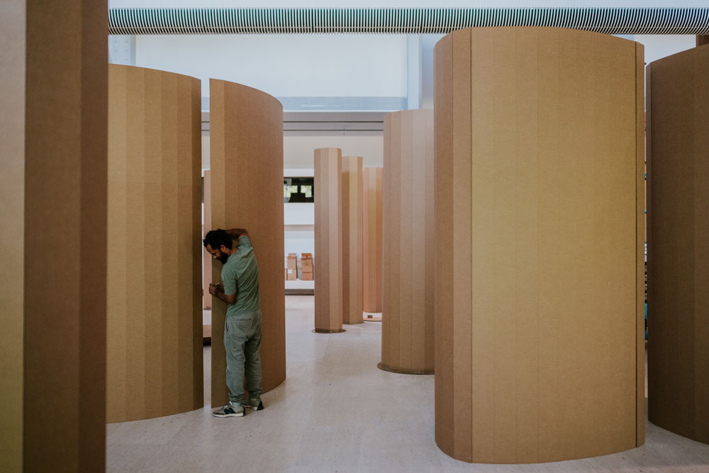 Para resumir o meu trabalho, quando olhamos para uma maquete, como essas grandes instalações, o que vemos é uma instalação de cartão e o edifício. Fica-se mais inquieto com as peças que faço. Elas apresentam-se como uma projeção mental, não é um espaço real. É como se as minhas peças dentro das arquiteturas fossem um eco daquilo que foi a maquete desse edifício.