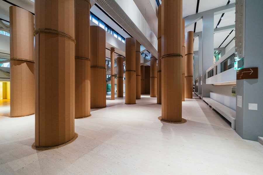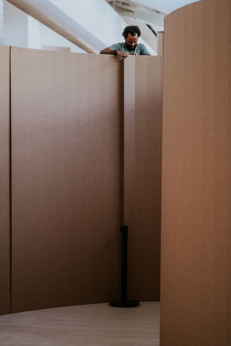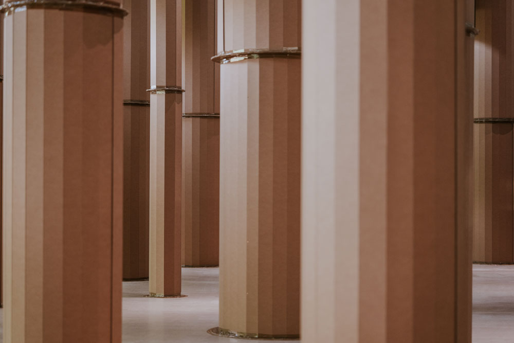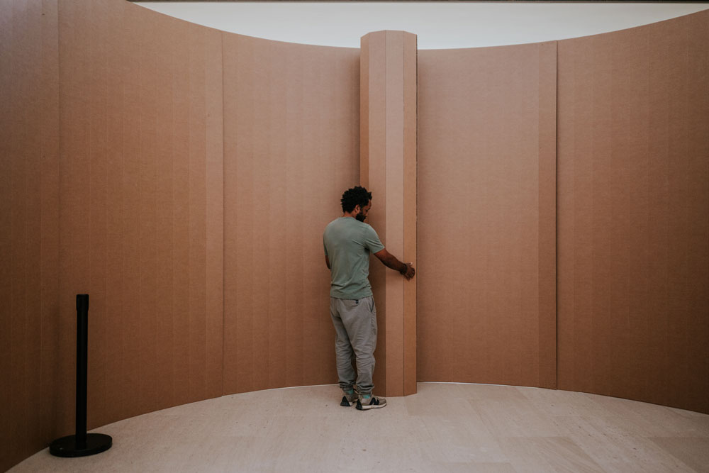 É bonito como as pessoas ficam agarradas ao cartão, porque o cartão é uma coisa familiar, que nos conecta com o dia-a-dia, com o banal. A caixa de cartão que estamos habituados, levada a essa monumentalidade nos deixa, outra vez, sem saber bem o que é aquilo: isto é cartão? não tem nada dentro? A tua cabeça não entende como esse material se aguenta – como é o caso do Bosque – como pode ter essa monumentalidade. Tu fazes perguntas.