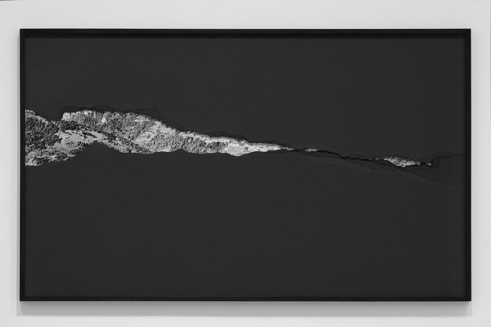 Il y a des séries, par exemple, comme Par la nuit qui emprunte des images à la société Lapie. C’est une société française qui a travaillé dans les années 1958–1962 et qui prenait des photos de tout le territoire français, de manière aérienne. J’ai découvert ce travail photographique, que je trouvais très beau. Ils ont photographié absolument tout le territoire. Moi, j’ai acheté les photographies qui concernaient les Pyrénées. Elles dataient du même moment où ces hommes faisaient le passage dans les années 60. C’était des documents d’archives très pertinents pour questionner géographiquement ces images. En les recouvrant d’un carton noir qui laisse par endroit visible la photographie en dessous cela m’a permis de questionner le rapport aux paysages, à la surveillance de la garde civile espagnole mais aussi à la mémoire.