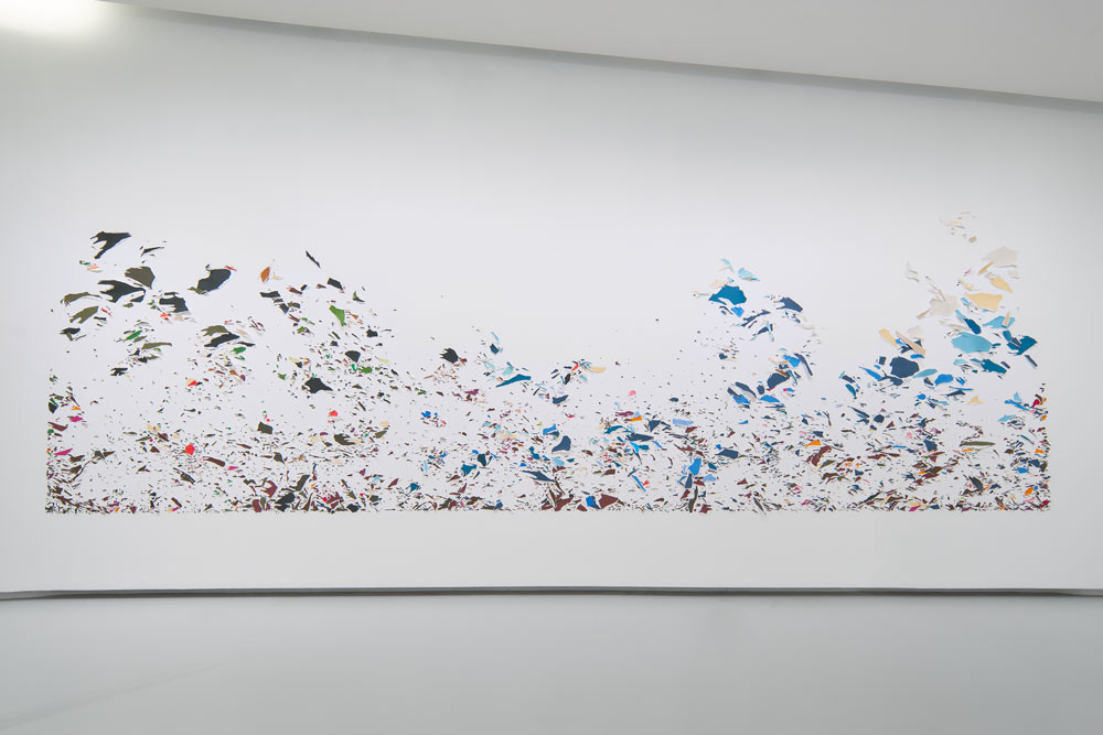 Quand tu arrives et que tu vois ce titre en latin — Fatum (Azur) — le fado vient de ce mot là aussi. Il signifie le destin, et dit tous les chemins possibles. Sauf qu’au lieu de montrer les lignes de la main, j’ai choisi de montrer les éléments de langage visuel avec lesquels je travaille, ce sont des papiers déchirés colorés. C’est ma main dans l’atelier, mais c’est surtout la relation directe : main–geste–papier–couleur.