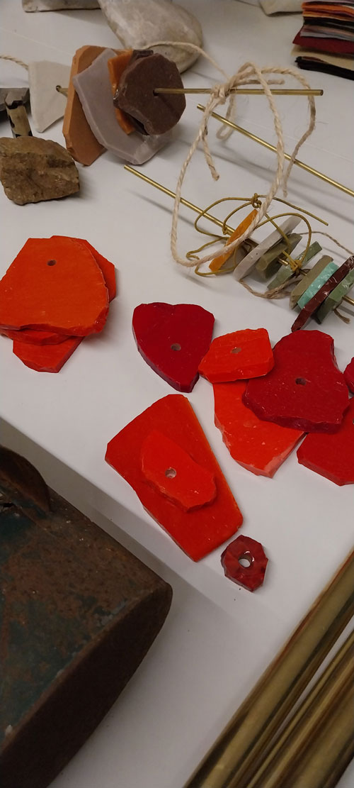 IF : En posant les sculptures au sol, j’ai tout à coup eu l’impression qu’un groupe d’hommes étaient là quelque secondes avant et qu’ils ont déguerpis en laissant leurs découvertes…Ce qui semble figé est mouvement…Mais quand je pense à la mobilité, comme toi je pense principalement à la pièce Les témoins. J’ai posé des roues sous cette sculpture parce que je voulais parler de la mobilité des passages. Ces roues annoncent non seulement celle des personnes, mais aussi celle du paysage, le dynamisme de la nature même si finalement les témoins ce ne sont pas les migrants eux-mêmes mais les montagnes. Elles ont vu passer, et elles voient encore passer aujourd’hui des gens sans papiers. Bien sûr, ils ne viennent plus du Portugal mais ce sont toujours les mêmes lignes qui sont traversées. Donc, tu as raison: il y a une grande mobilité dans cette exposition, mais aussi dans mon travail en général. Si les choses sont très déterminées, il y a toujours quelque chose que je laisse faire. Je mets des éléments ensemble mais il y a toujours un moment qui agit sans moi. Je mets tout en place, mais après… [Isabelle fait un son qui suggère le mouvement] ça part. Je ne veux pas tout contrôler.